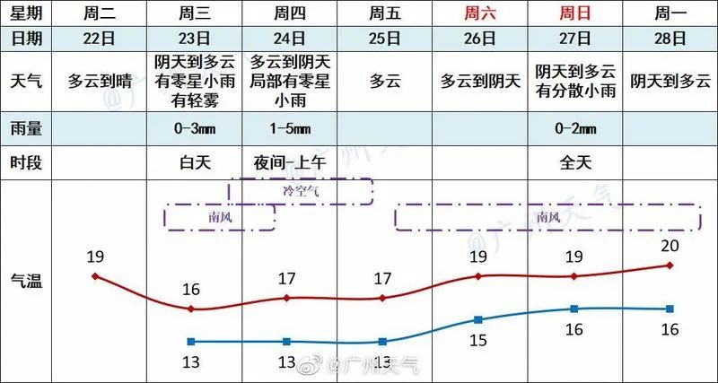 未来一段时间广州天气走势。@广州市气象台官方微博按照一些气象爱好者对日平均气温低于10℃称为“冬日”的“俗称”,本轮较强冷空气为广州带来了3天“冬日”。在12月22日上午,广州各区已解除寒冷黄色预警信号。