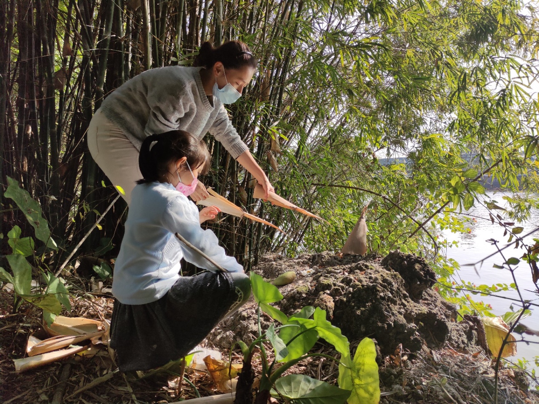 亲子家庭在白鹭生态岛进行大地艺术创作