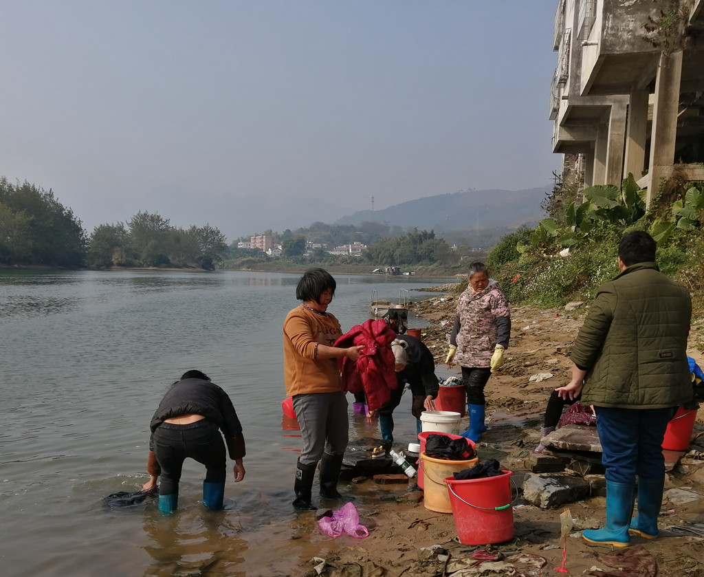 清远市阳山县青莲镇青莲村,是一个形态上村、街合一的优美小村庄。秤架河从村边流过,勾画出一连串古风犹存的青石码头。河上仍有船屋住着人,村民们在河边互相帮手洗衣服。近冬至时节,水位不高,水中几个沙洲点缀,对岸山影连绵,似能听见山岚之声。