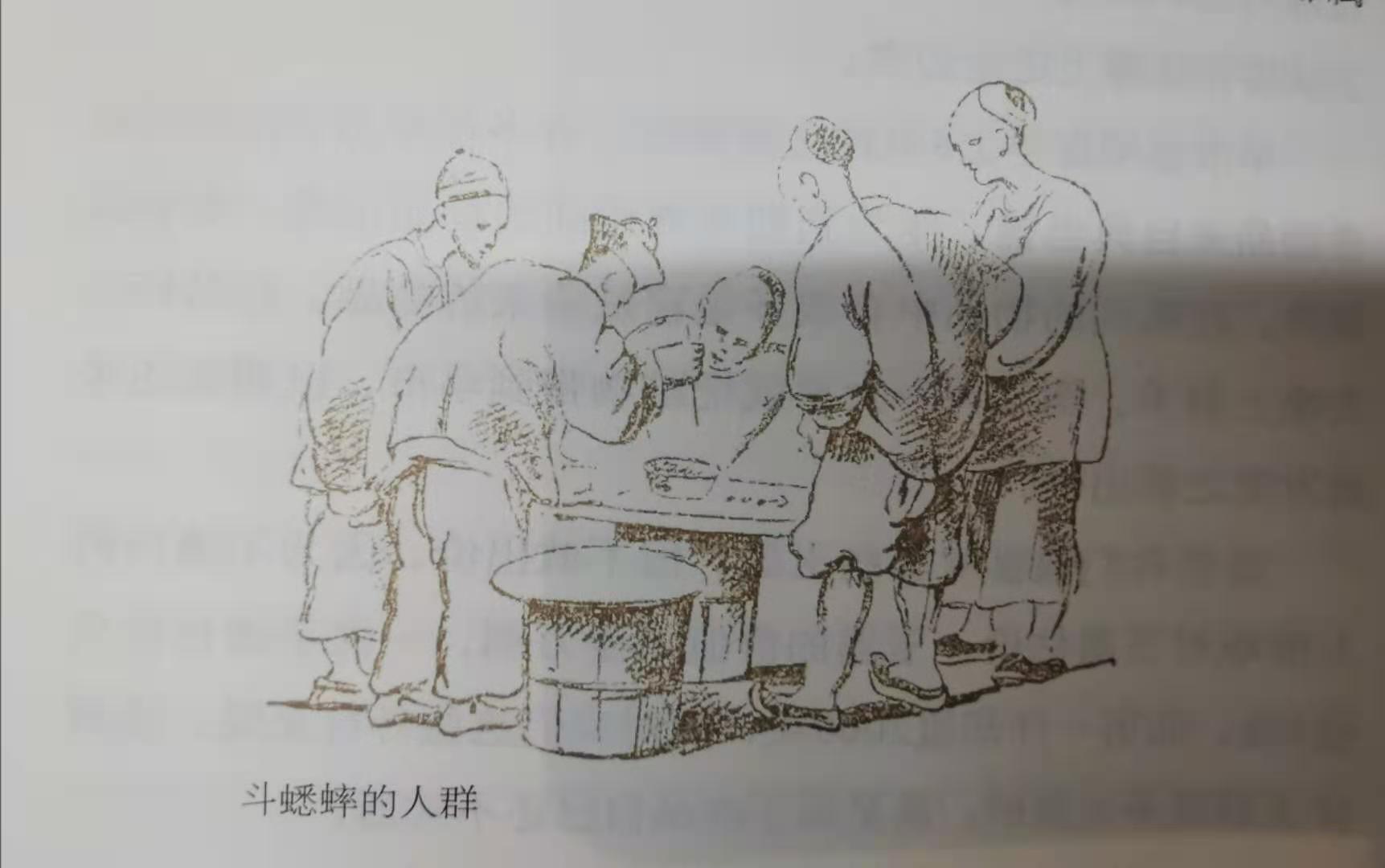 比如斗蟋蟀。在大街上,各色人等围作一团,兴致勃勃。这种赌博是当时人们业余生活的重要组成部分。