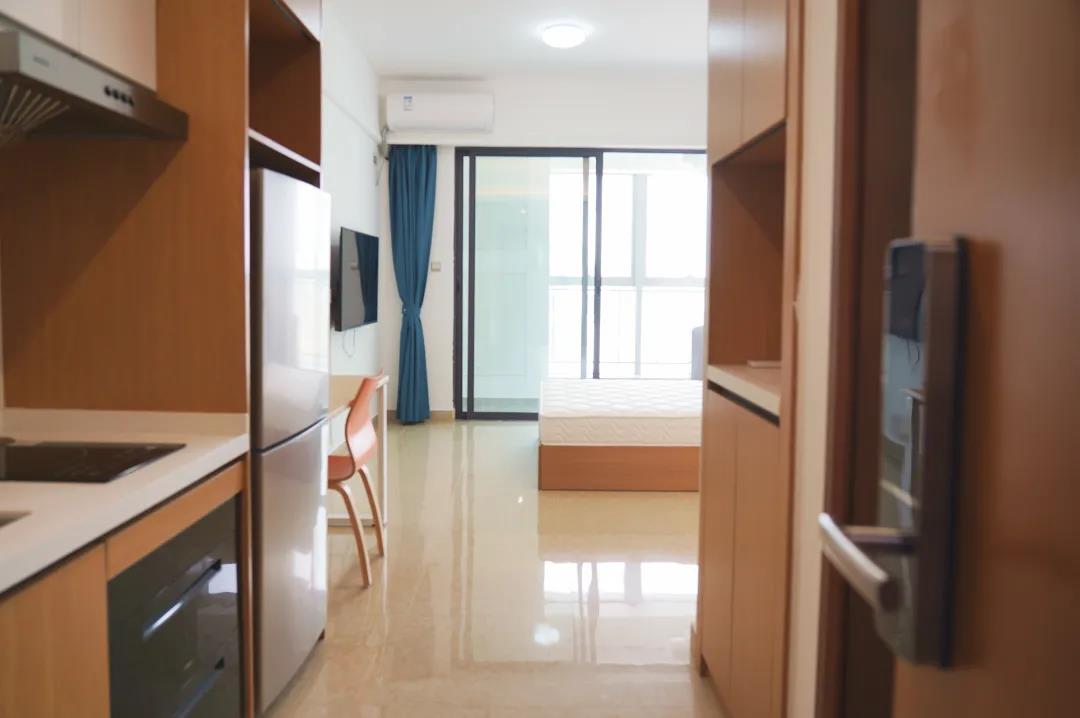 进入标准间内,米白色加浅棕色的基调明亮,屋内床、衣柜、办公桌椅、空调、电视机、冰箱、洗衣机、电磁炉、油烟机、消毒碗柜等家俬家电一应俱全。户外阳台使公寓内光线充足,环境舒适。