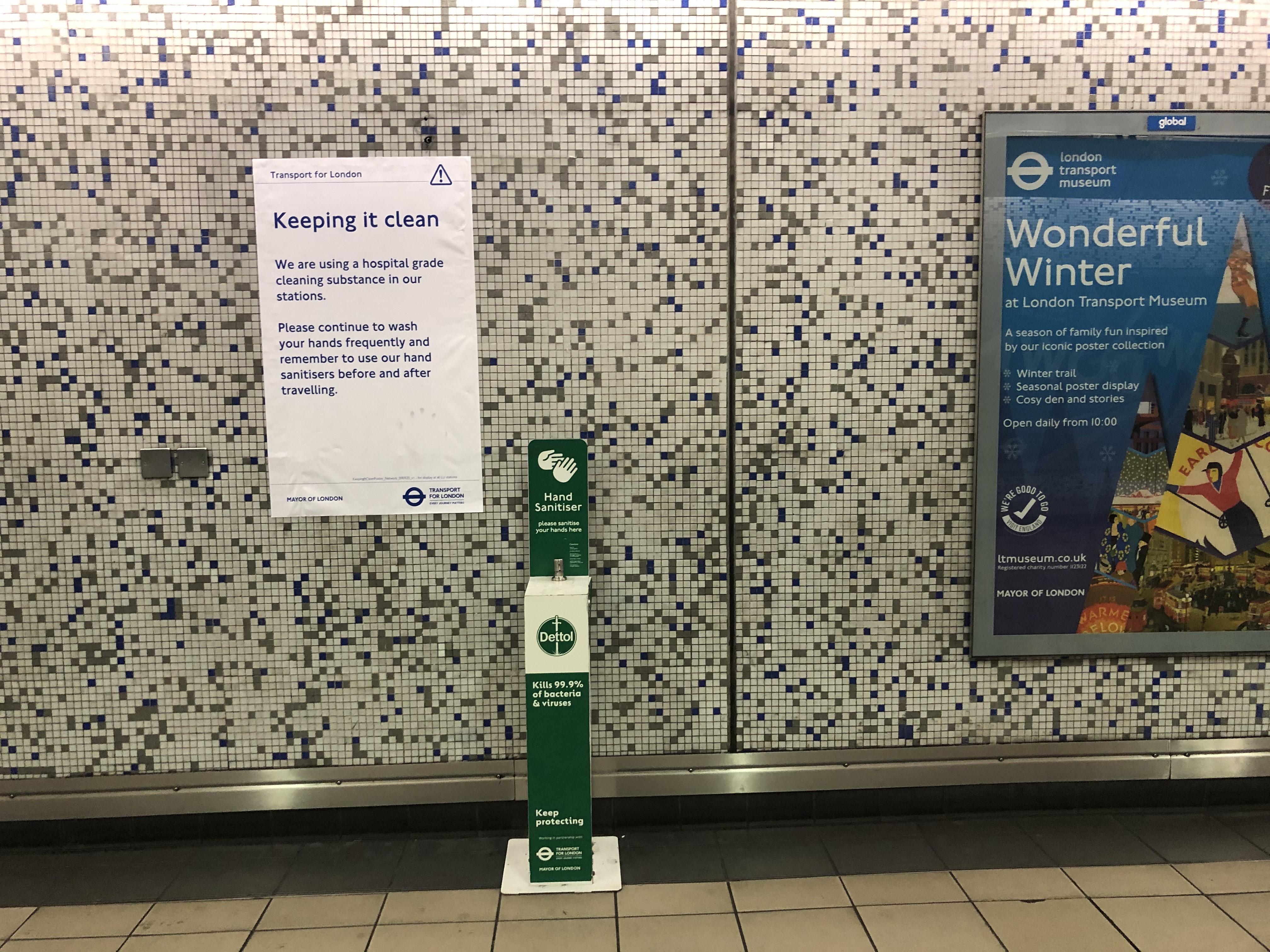 地铁站里有消毒洗手液和保持社交距离的提示。