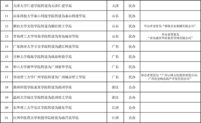 24日,教育部官方网站发布《关于拟同意设置本科高等学校的公示》,拟同意中北大学信息商务学院等33所独立学院转设为独立设置的本科学校。其中广东有4所独立学院拟转设,分别为:广东海洋大学寸金学院转设为湛江科技学院,吉林大学珠海学院转设为珠海科技学院,中山大学新华学院转设为广州新华学院,华南理工大学广州学院转设为广州城市理工学院(举办者变更为“广州云峰文化教育有限公司、广州市宏峰房地产开发有限公司”)。