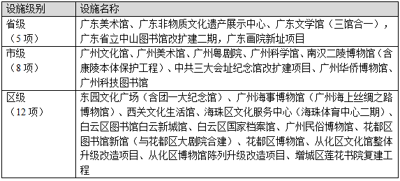 省级重点文化设施项目5项:分别为广东美术馆、广东非物质文化遗产展示中心、广东文学馆(三馆合一)、广东省立中山图书馆改扩建二期、广东画院新址项目。