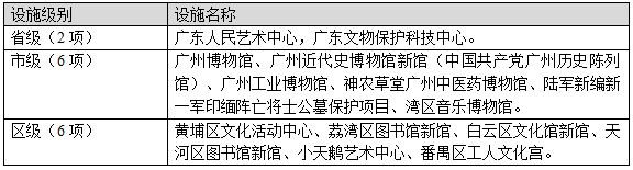 区级重点文化设施项目6项:黄埔区文化活动中心、荔湾区图书馆新馆、白云区文化馆新馆、天河区图书馆新馆、小天鹅艺术中心、番禺区工人文化宫。