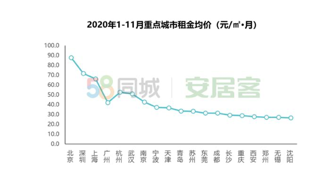 近日,58同城、安居客发布了《2020年中国住房租赁市场总结报告》,数据显示,四大一线城市的在线租赁房源供应量仍然领先全国,广州排名第四,同时在四大一线城市中的租房需求量,也同样位列第四。但在重点城市租金均价方面,尽管2020年1-11月全国重点19城的平均租金在41.2元/㎡月,与去年相比波动不大。但广州和其他一线城市以及部分强二线城市相比,租金压力要明显小很多,租金在40元/㎡/月左右,远低于北京、深圳和上海,甚至还低于杭州、武汉和南京。其他重点城市的平均租金主要集中在20-40元/㎡/月。