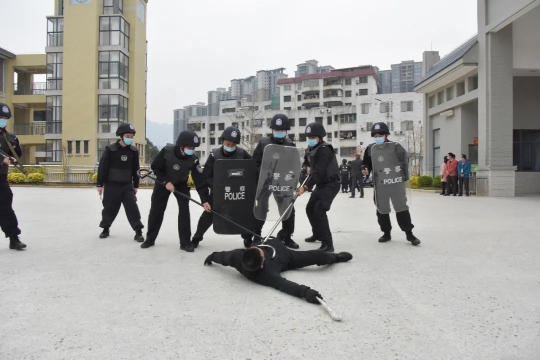 在开展演练前,公安民警向校园安保人员讲解各类反恐防爆器械的用途和如何正确使用反恐防暴器械,下午3时,在学生统一放学期间,两名“歹徒”持刀试图闯进学校大门进入校园,学校安保人员立即上前阻挡,与“歹徒”周旋,值班老师带领学生往安全区域撤离并拨打报警电话。城南派出所接到报警后第一时间赶赴现场处警,随即,增援警力迅速集结并到达现场,立即对现场实施封控,劝离围观人员,疏散师生,并分为两队突击小组,分工配合展开处置,成功制服并控制“歹徒”,完成对爆恐事件的处置工作。演练过程逼真到位、紧张有序,环节衔接得当,人员各司其职,达到预期效果。