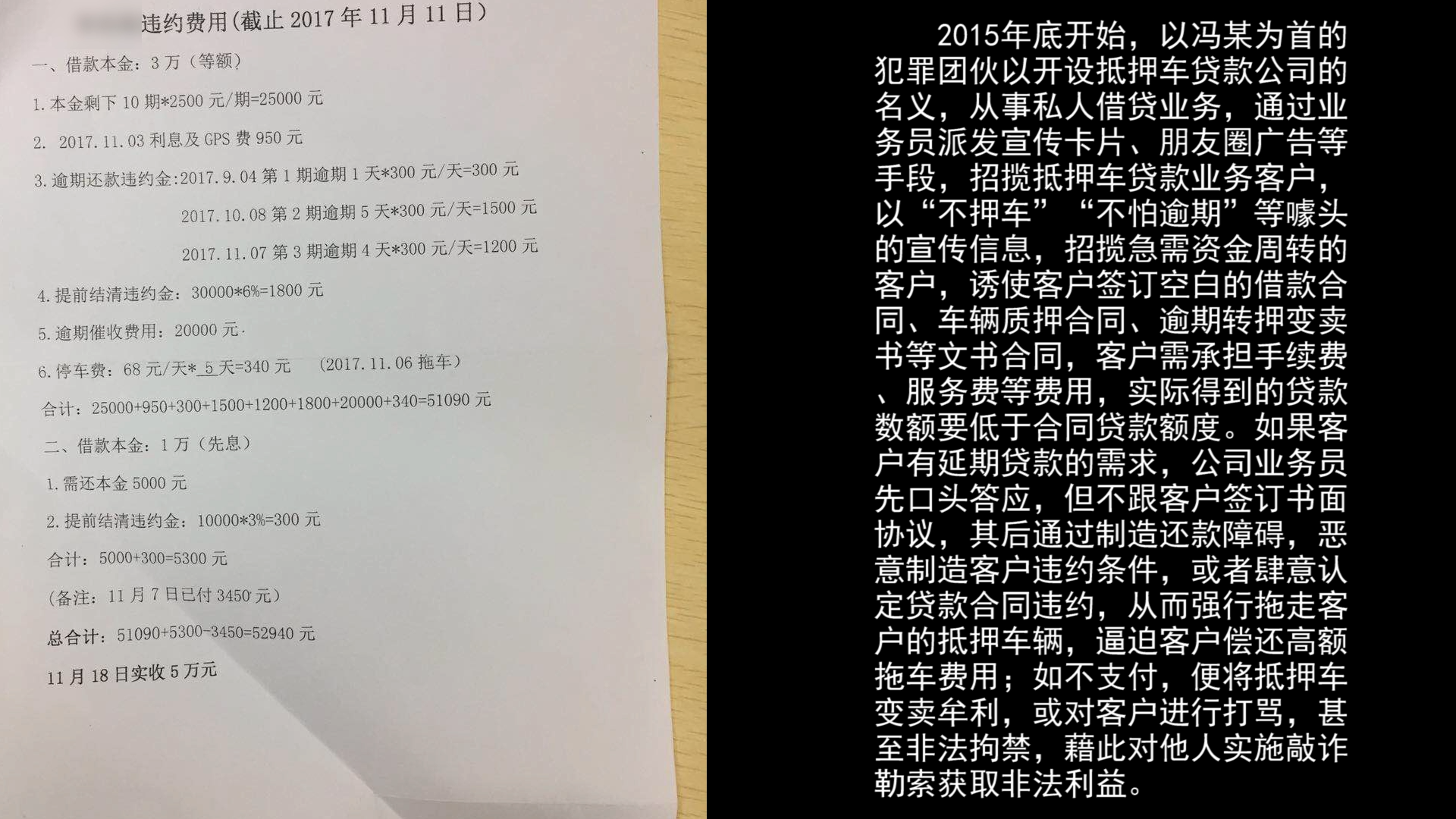 通过前期调查,警方发现,自2015年底开始,以冯某为首的犯罪团伙以开设抵押车贷款公司的名义,从事私人借贷业务,通过业务员派发宣传卡片、朋友圈广告等手段,招揽抵押车贷款业务客户,以“不押车”“不怕逾期”等噱头的宣传信息,招揽急需资金周转的客户,诱使客户签订空白的借款合同、车辆质押合同、逾期转押变卖书等文书合同,客户需承担手续费、服务费等费用,实际得到的贷款数额要低于合同贷款额度。