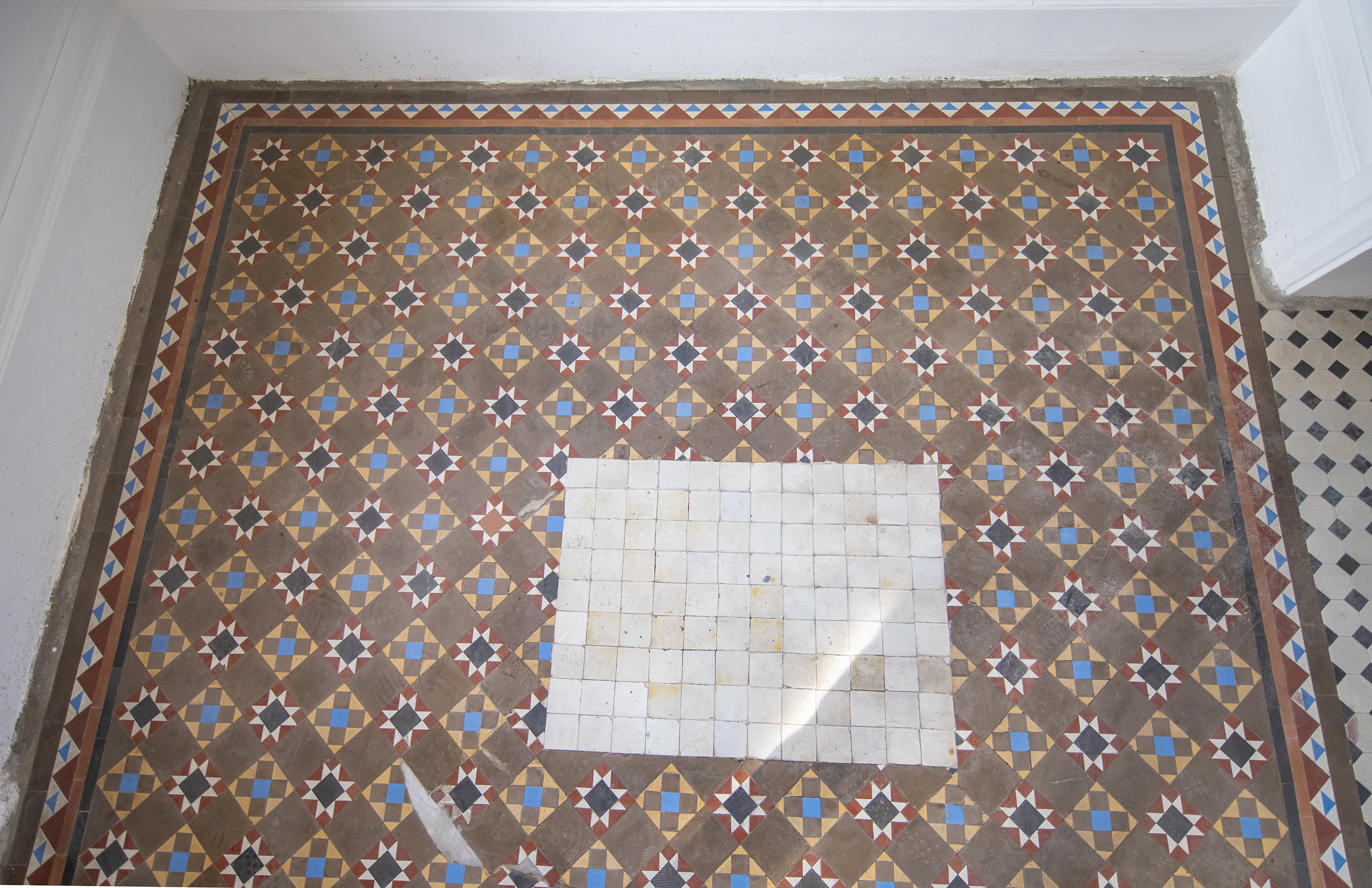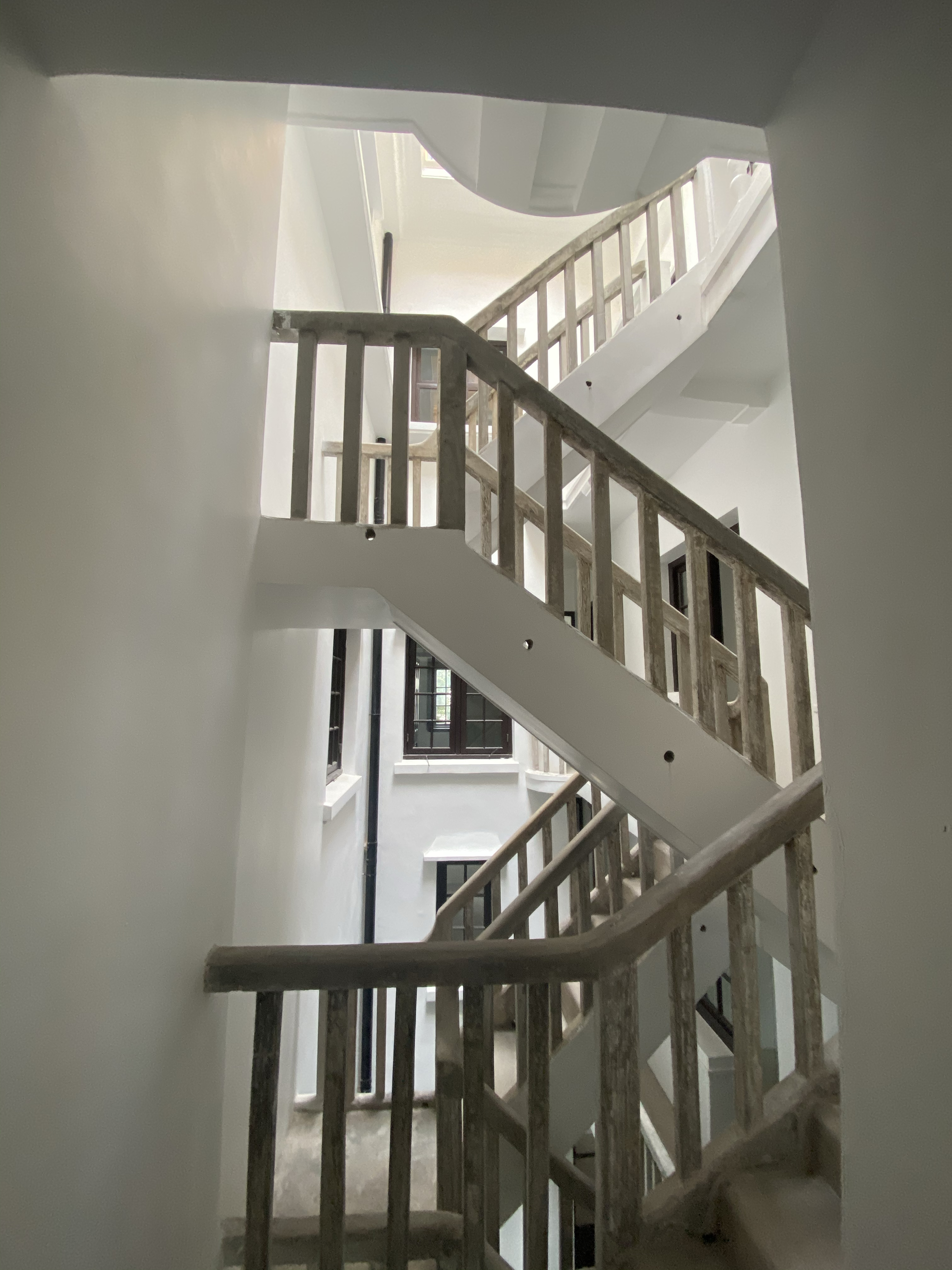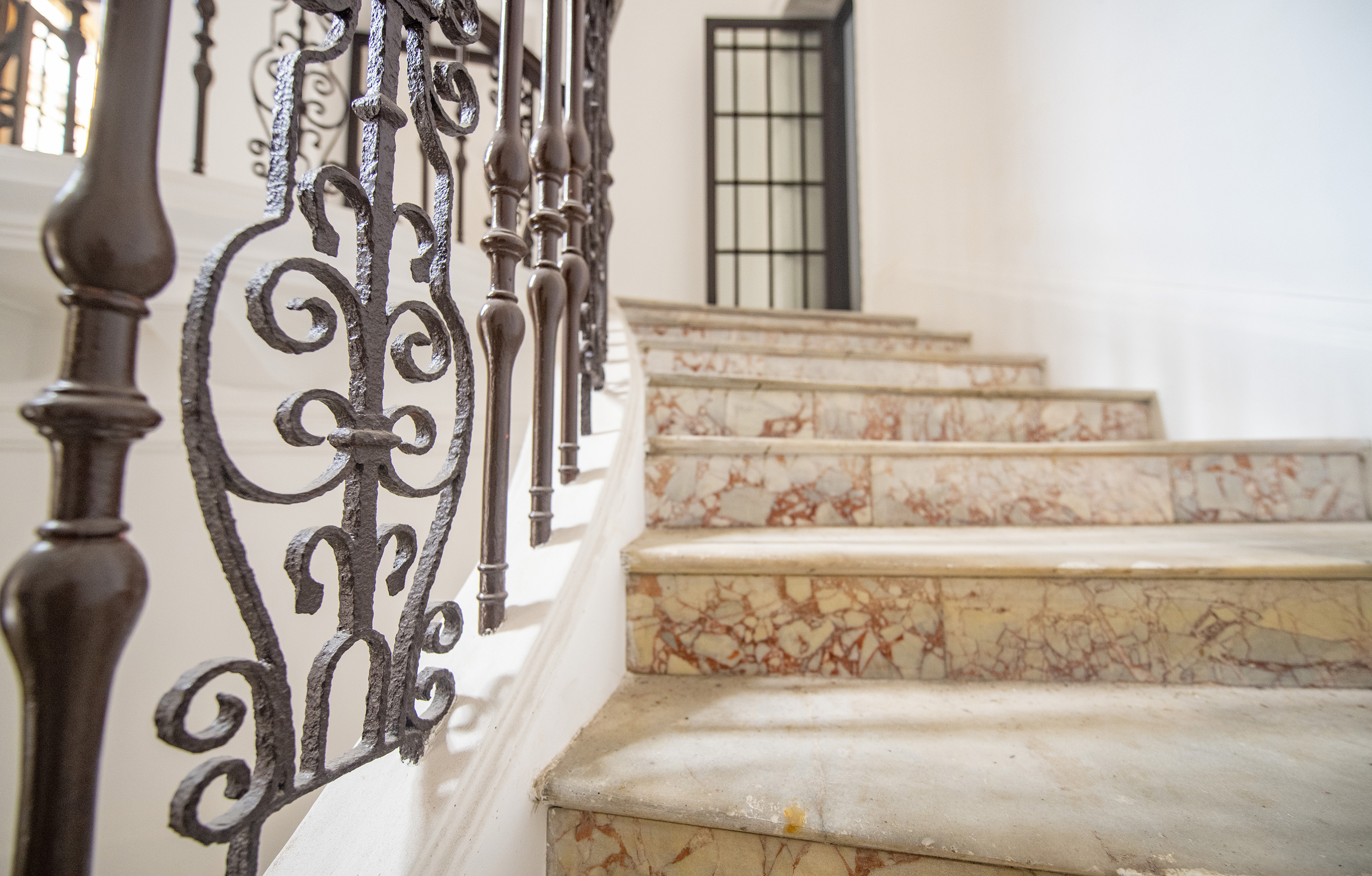 大旋转楼梯是公馆最有特色的建筑构件。据了解,原有的楼梯构件缺损,“很多构件为曲线,工艺比较复杂,须现场手工做,施工单位前后历时4个月时间才修复好。”江伟辉表示,他们还把绣花功夫花在楼梯台阶和花砖的修复上。云石台阶有破损不会整块换掉,而是局部进行修补,花砖的纹样虽不复杂,也是局部修补,甚至是抠出破损的部分,换上同样的花色,因此可以明显看到花砖有新旧两种颜色。据悉,因是少批量花砖更换,施工过程中,不得不手工制作花砖再由工匠们逐片更换,因此人工成本十分高。
