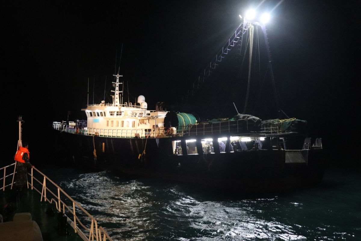 黑色船体、白色上层建筑印着“NO SMOKING”显目的字眼,一艘大型船舶出现在湛江海警局执法艇的监视范围。“这是‘大象’!”执法艇第一时间将发现目标船的情况上报至指挥中心。“收网!”执法艇接到指挥中心的指令迅速将该船进行靠帮登临,这标志着专项行动的全面收网行动正式开始。