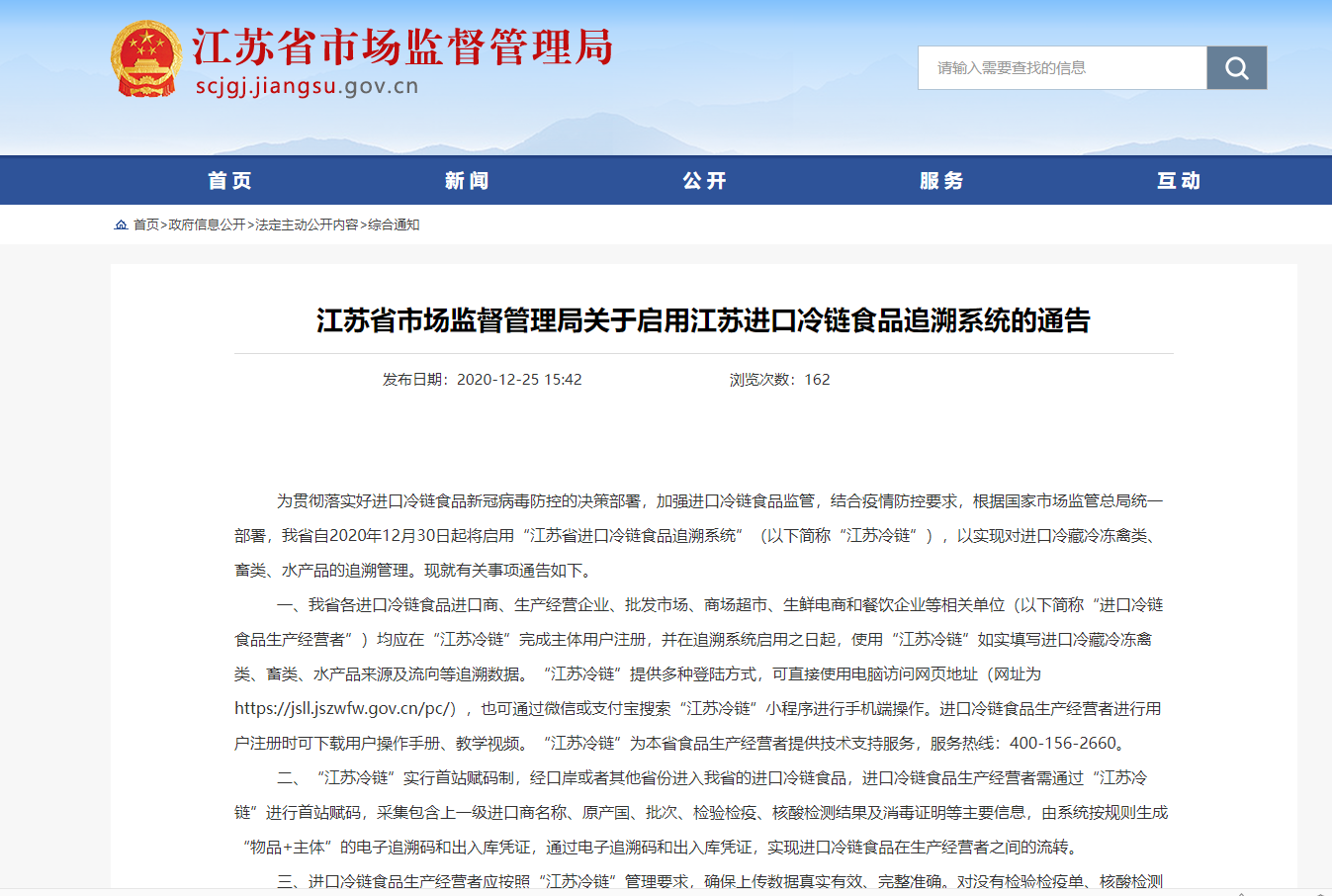 江苏省市场监督管理局发布《关于启用江苏进口冷链食品追溯系统的通告》,自2020年12月30日起,江苏省将启用“江苏省进口冷链食品追溯系统” (以下简称“江苏冷链”),以实现对进口冷藏冷冻禽类、畜类、水产品的追溯管理。