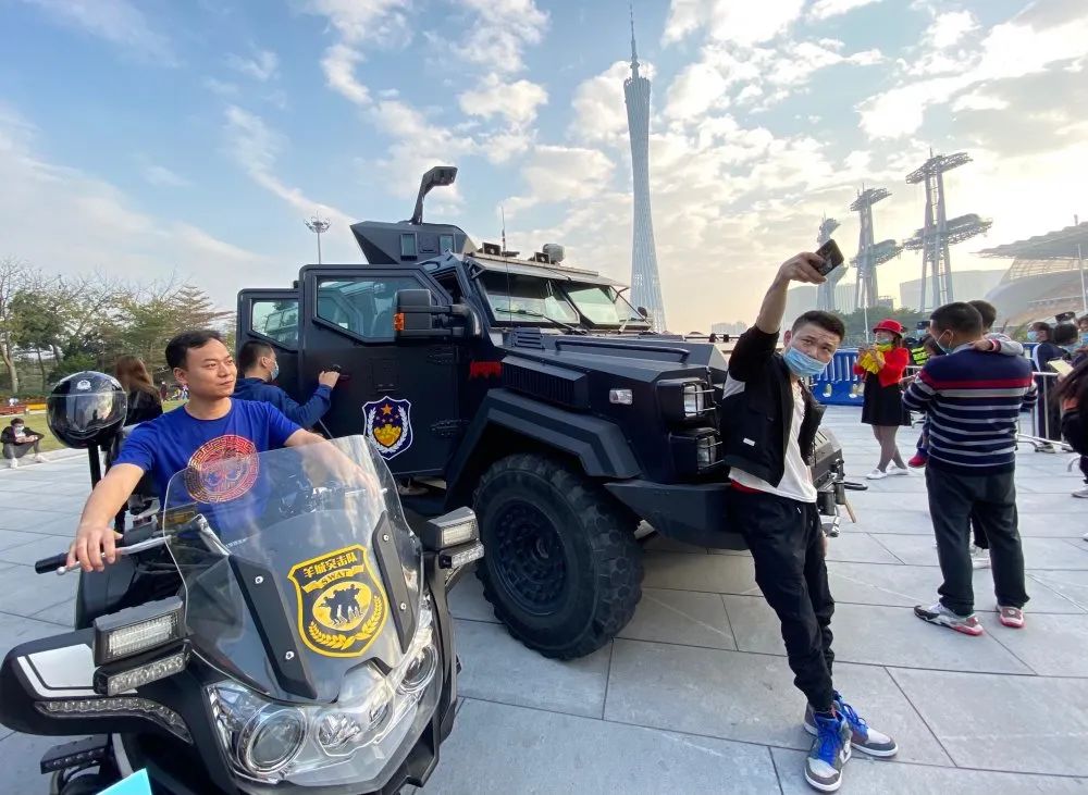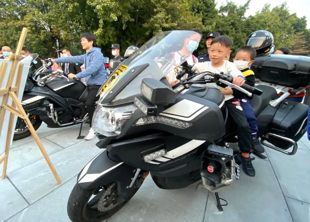 警用摩托车和防爆车现场展示,吸引市民体验拍照。