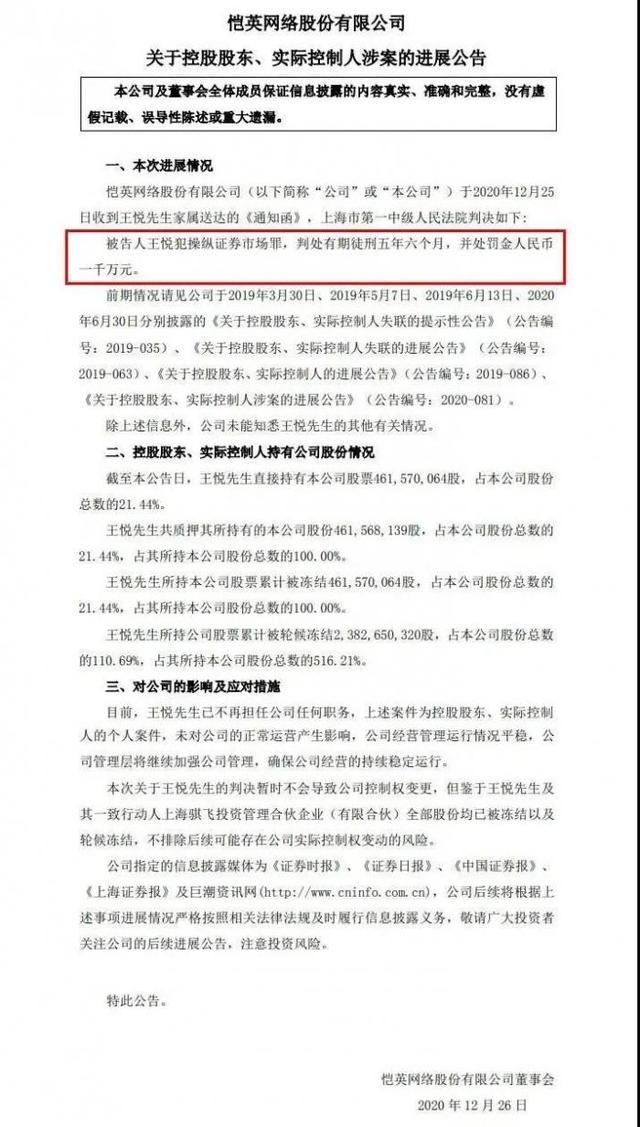 早在2019年5月,恺英网络公告,称公司收到王悦的家属送交的《告知函》,其家属称收到上海市公安局的《拘留通知书》,王悦因涉嫌操纵证券市场罪被上海市公安局刑事拘留,并由上海市公安局冻结了王悦所持的全部公司股份。