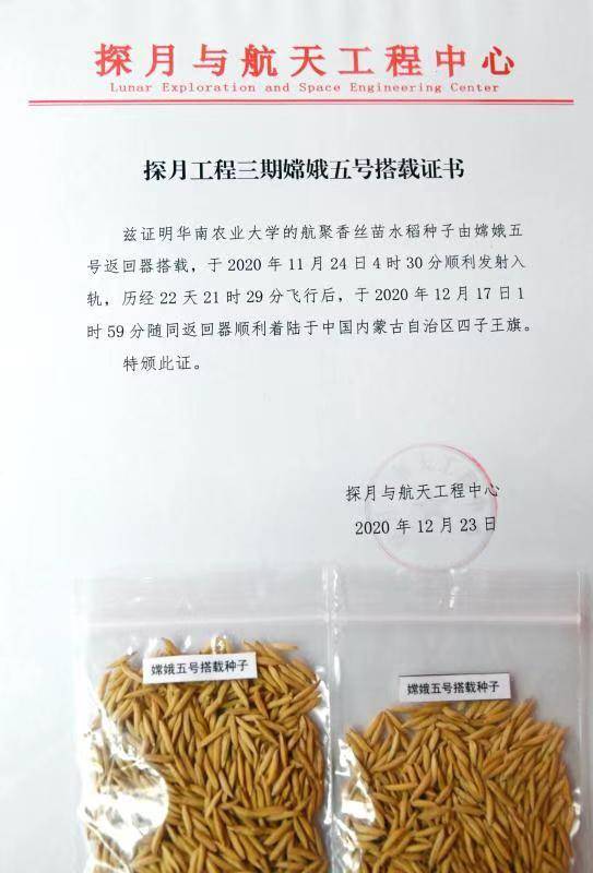 华南农业大学(下称“华农”)国家植物航天育种工程技术研究中心成为此次空间搭载试验的重要科研单位。历经22天21时29分的飞行后,一批共重40克的“航聚香丝苗”水稻种子于12月17日1时59分随同返回器顺利着陆,标志着我国水稻航天育种首次完成深空空间诱变试验的搭载,具有里程碑式的意义。
