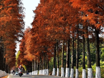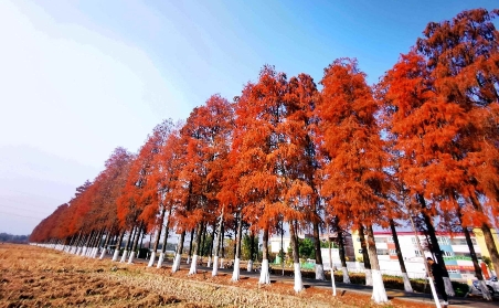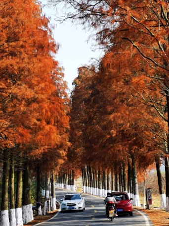 据了解,县道X344线的落羽杉多栽种于1990年至1992年间,经过近30年的生长,如今这些落羽杉树干高耸入云,树形秀丽优美,有“最美乡村公路”之称。每年秋季开始,该路段的落羽杉便开始“换装”,到12月中下旬完成“换装”,是最佳的观赏期。这期间,落羽杉从绿色变成黄色、黄色变成红色、红色又变成深红色,成为“深秋最佳打卡点”。