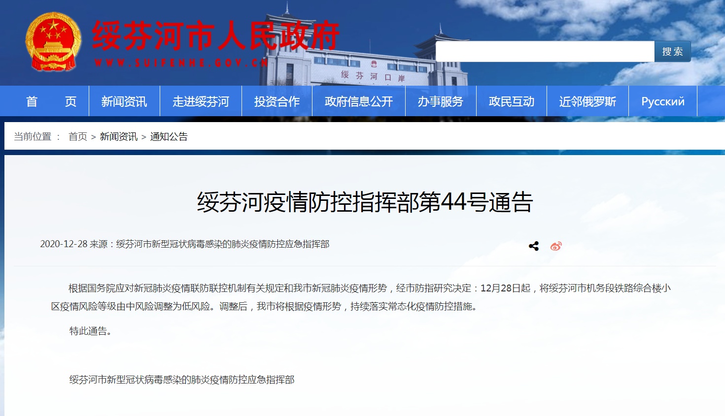 绥芬河市人民政府网站12月28日消息,根据国务院应对新冠肺炎疫情联防联控机制有关规定和绥芬河市新冠肺炎疫情形势,经市防指研究决定:12月28日起,将绥芬河市机务段铁路综合楼小区疫情风险等级由中风险调整为低风险。调整后,绥芬河市将根据疫情形势,持续落实常态化疫情防控措施。