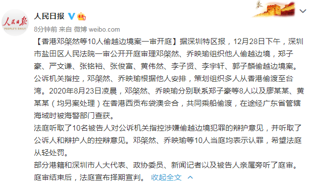 @人民日報微博法庭聽取了10名被告人對公訴機關指控涉嫌偷越邊境犯罪的辯護意見,並聽取了公訴人和辯護人的控辯意見。鄧棨然、喬映瑜等10人當庭均表示認罪,希望法庭從輕處罰。