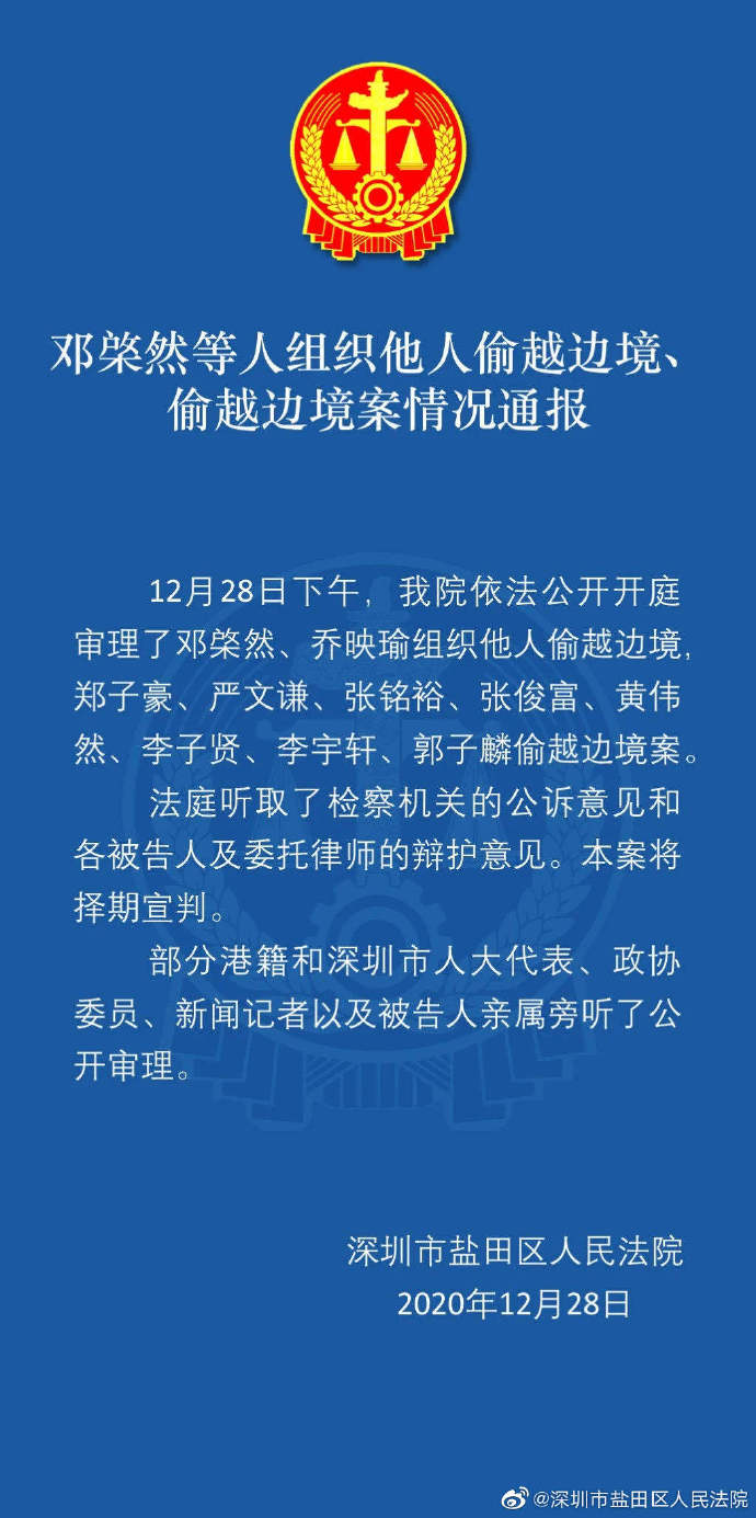 12月28日下午,深圳市鹽田區人民法院一審公開開庭審理鄧棨然、喬映瑜組織他人偷越邊境,鄭子豪、嚴文謙、張銘裕、張俊富、黃偉然、李子賢、李宇軒、郭子麟偷越邊境案。