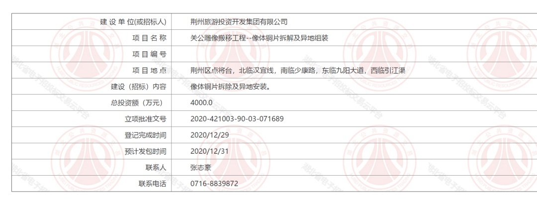 关公雕像搬移工程——像体铜片拆解及异地组装项目报建公告。 湖北省电子招投标交易平台 截图