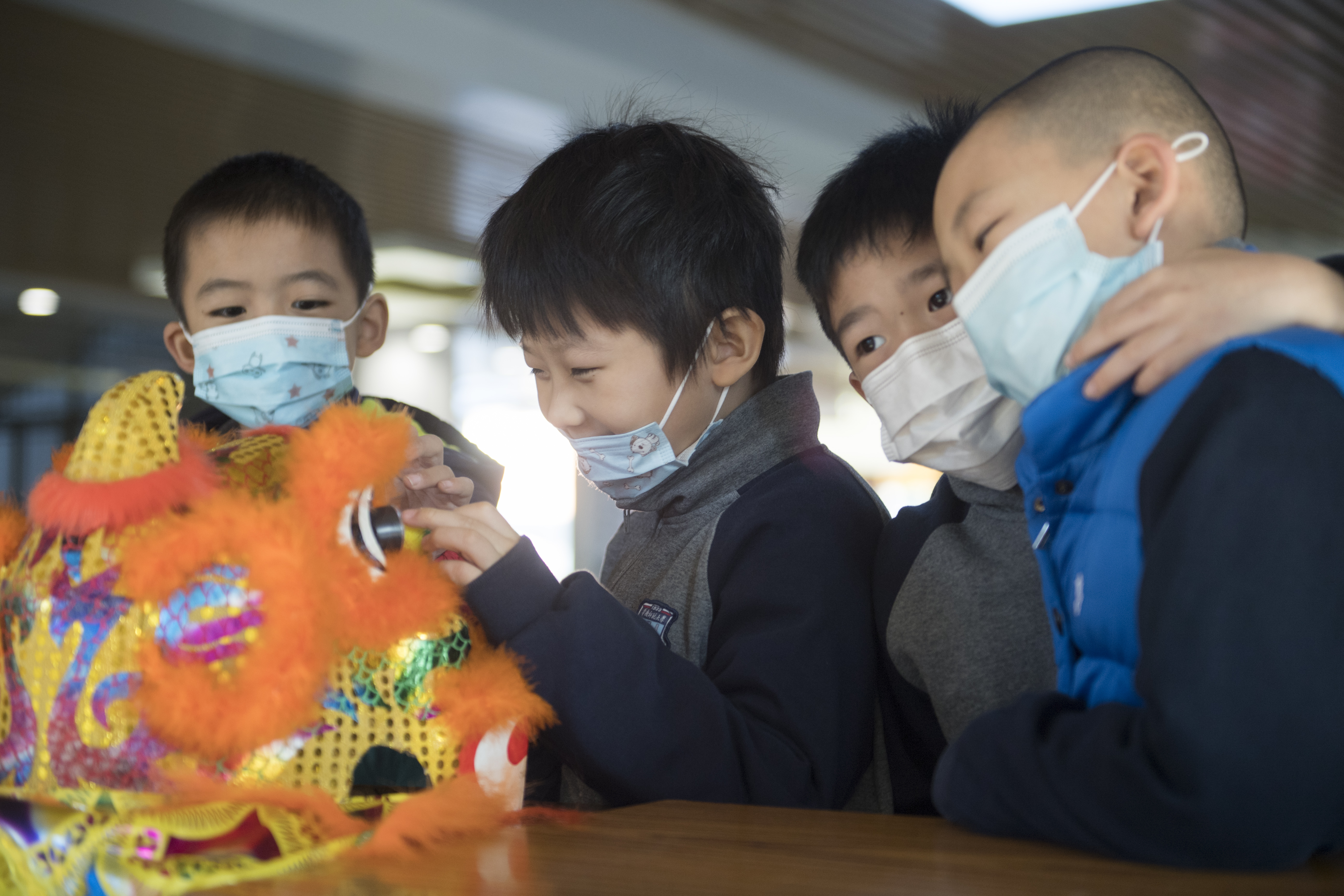 学生在观赏现场展示的岭南狮头