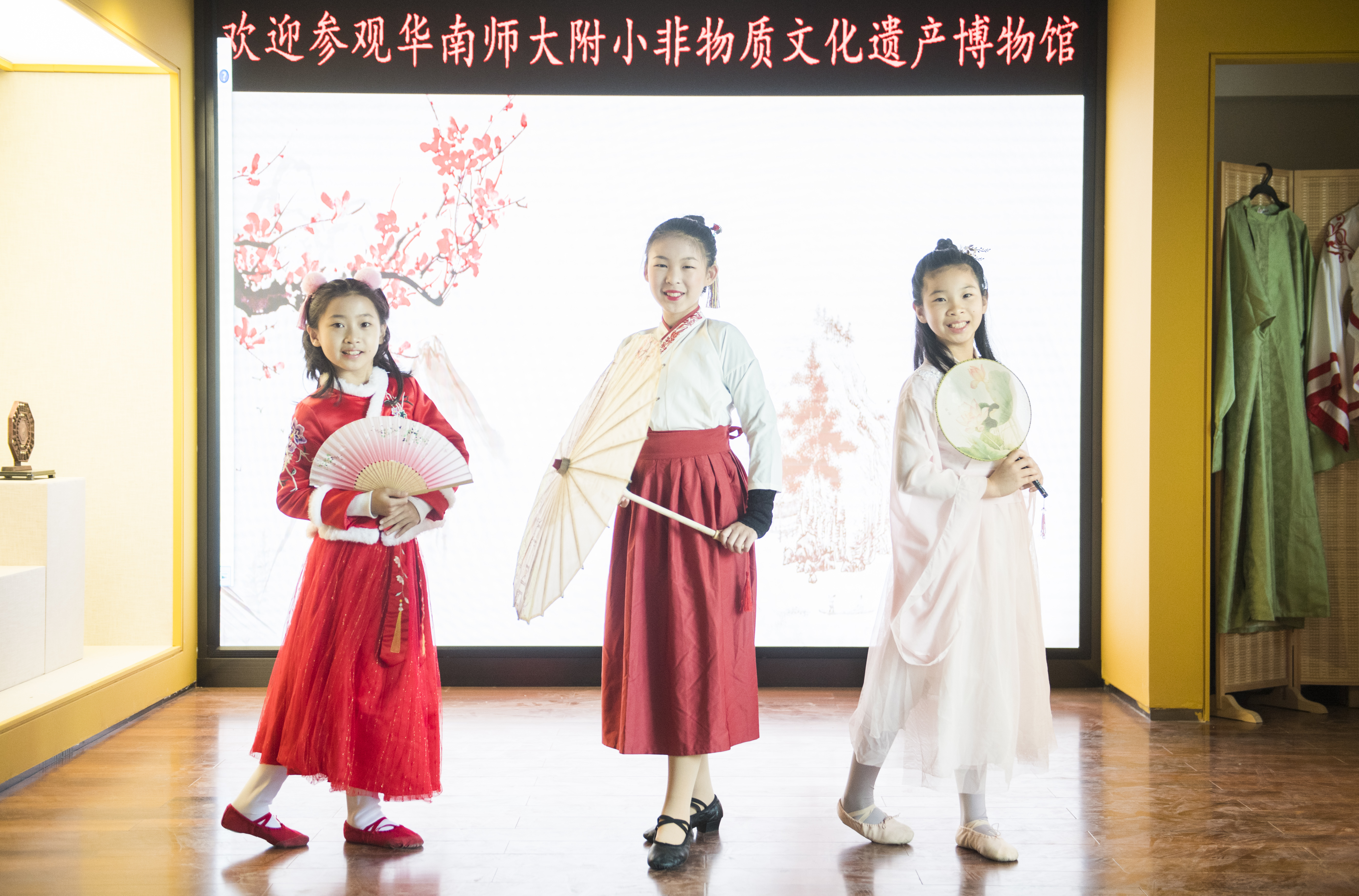 非遗博物馆设在华南师大附小腾飞楼三楼,一楼是非遗文化学习区、传统民间艺术体验区等。记者在非遗博物馆看到,文物展陈包罗万象,以形色相依、动静结合、虚实交融等方式呈现。有独具岭南特色的粤剧、潮剧、英歌舞;源自大江南北的京剧、昆曲、川剧变脸、醒狮龙舞;古琴艺术、周易文化和二十四节气……“我最喜欢汉服,所以今天穿来展示。”五年级学生吴芮孜在进行汉服展示,她笑着说,“非遗博物馆特别漂亮,里面有很多传统文化等着我们去探索。”