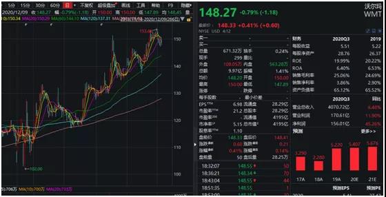 与此相对应的是,沃尔玛股价和市值近日不断创下新高,12月初股价一度达到156.3美元的历史新高。近日虽有所调整,但股价仍有144.33美元,总市值达4084亿美元,折合超过2.6万亿人民币。