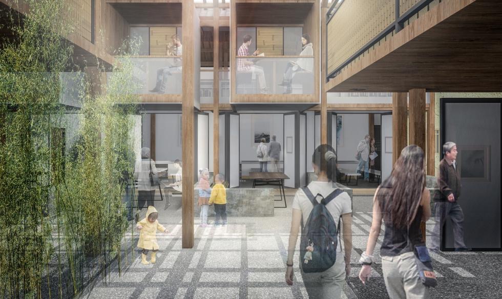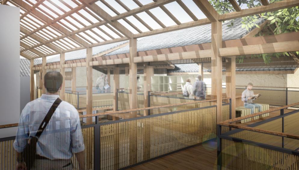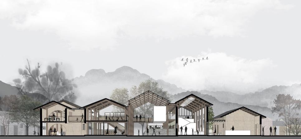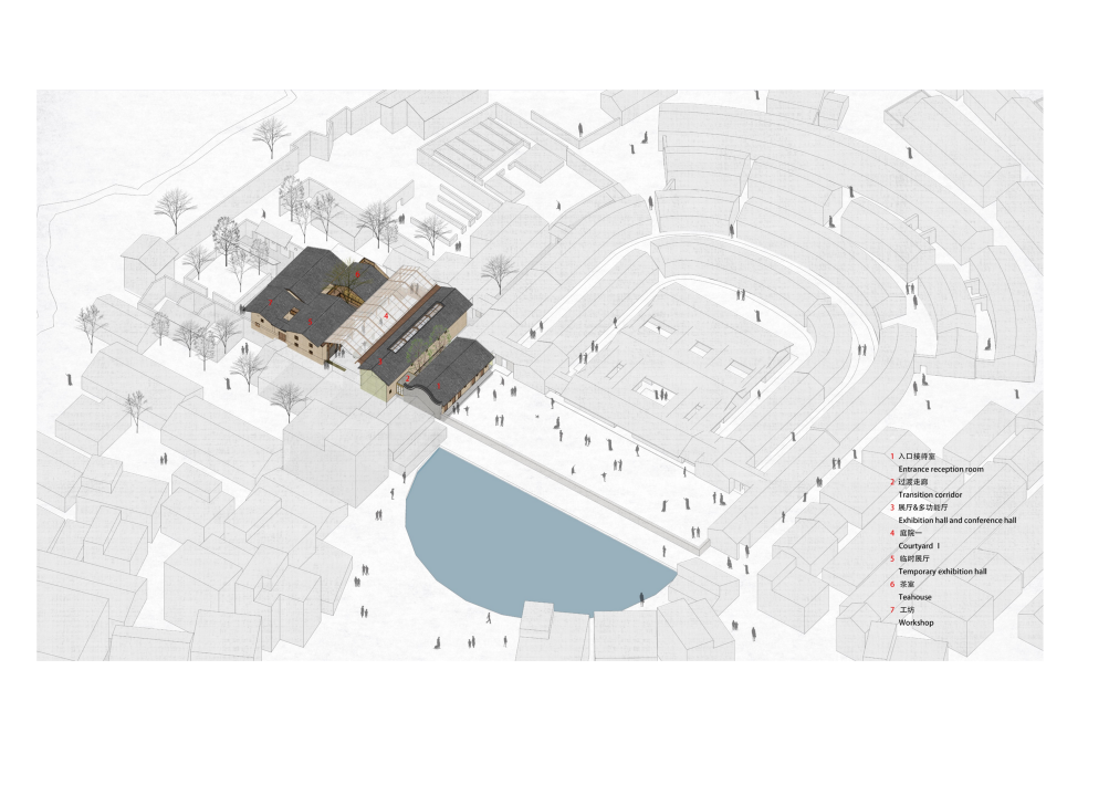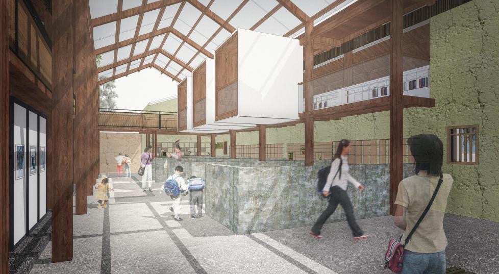 方案通过对大湖镇多维度的前期规划调研分析,结合建筑遗产与古驿道的互动关系,从激活社区公共空间、延续历史风貌记忆、丰富社区基础设施等切入点进行了活化设计探索。设计充分尊重场地历史信息,在完整保留场地原有空间格局、留存遗迹和树木的基础上,通过替换和植入部分结构体系,打通了原来狭小分隔的建筑内部空间,创造出流动多变的空间体系,更好地适应建筑转变为研学展示、旅游服务、社区服务的多种复合功能。