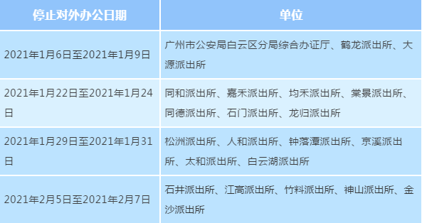 (一)出入境业务:2021年1月6日至9日(周三至周六),原位于白云大道北331号的出入境大厅停止对外办公。1月11日(周一)新址正常对外办公。(停止对外办公期间,如有急事急办,可预约到广州市其他出入境办证大厅办理)