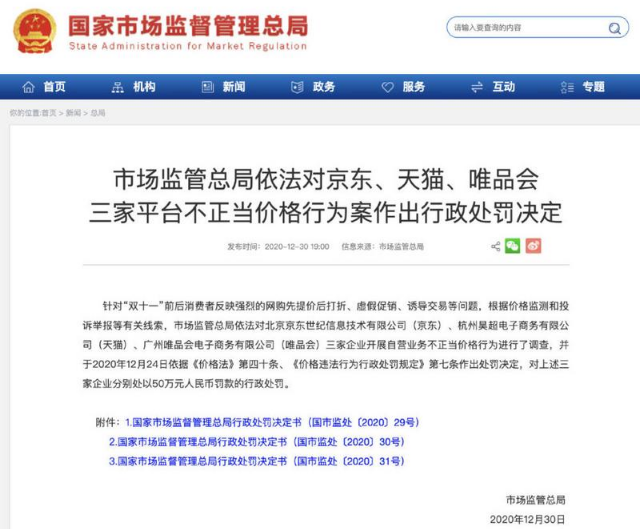 【京东、天猫、唯品会三家平台被处罚 】针对“双十一”前后消费者反映强烈的网购先提价后打折、虚假促销、诱导交易等问题,根据价格监测和投诉举报等有关线索,市场监管总局依法对北京京东世纪信息技术有限公司(京东)、杭州昊超电子商务有限公司(天猫)、广州唯品会电子商务有限公司(唯品会)三家企业开展自营业务不正当价格行为进行了调查,并于2020年12月24日分别处以50万元人民币罚款的行政处罚。详情>>