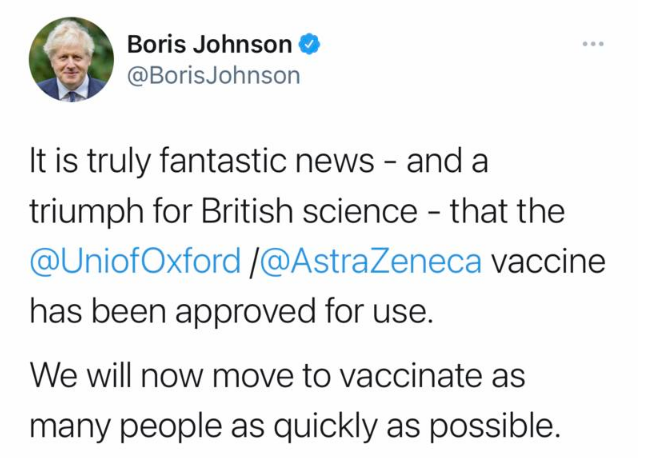 【亲历伦敦封城|牛津疫苗获批,1月4日全面启动】在日增5.3万例的英国疫情至暗时刻,当地时间12月30日清晨,英国政府网上挂出了牛津疫苗获批的消息。英国首相鲍里斯在推特上表示:这是真正令人兴奋的消息,是英国科研的胜利,接下来将以最快的速度为尽可能多的人接种。详情>>