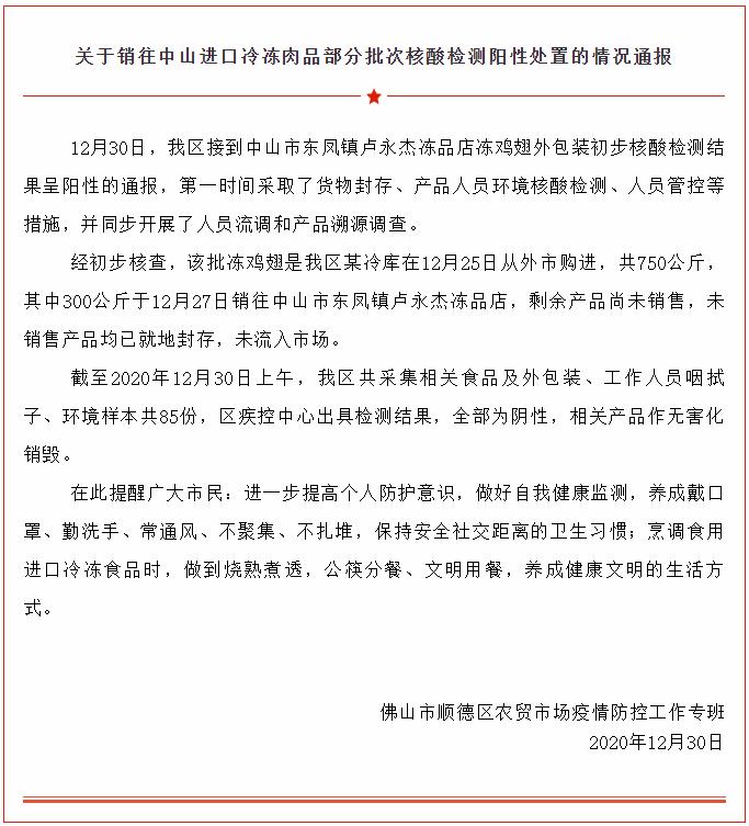【顺德销往中山进口冷冻肉品部分批次核酸检测阳性,最新通报来了!】30日凌晨,中山东凤通报称,一市场冻鸡翅外包装样本阳性,显示来源为佛山顺德一冻品公司,目前顺德区已紧急处置,未销售产品均已就地封存,未流入市场。详情>>