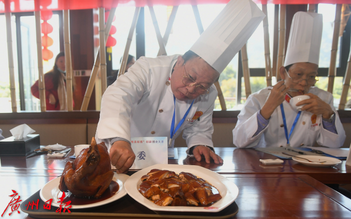 脆皮芝麻鸡、碧绿花雕鸡、金凤献瑞、君子六味鸡、温泉蛋姜脆鸡、家乡捞起鸡……比赛现场,创新组的20位青年粤菜师傅纷纷亮出自家拿手绝活,用精湛的厨艺,为现场的专家评委和嘉宾奉献了一道道色香味俱全的佳肴。评委黄炽华表示,从菜品评判来看,年轻的粤菜厨师在粤菜的烹饪技艺上,有很大的进步,并在传统的基础上,进行了必要的改良和创新。他举例说,“刚刚一位选手做了广东十大名鸡—-筒子油鸡。他在传统的基础上,加入了烟熏的方法,整体上提高了鸡的香味。”