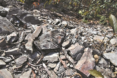 现场发现的菊石化石。距离万绿湖畔水面约15米