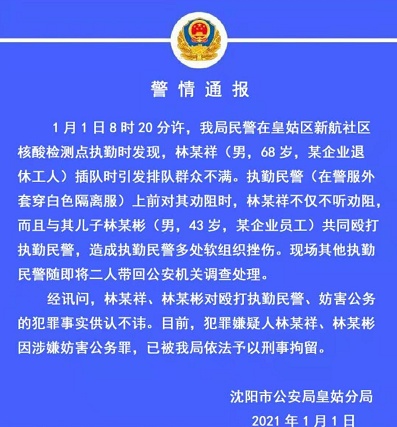 1月1日8时20分许,我局民警在皇姑区新航社区核酸检测点执勤时发现,林某祥(男,68岁,某企业退休工人)插队时引发排队群众不满。执勤民警(在警服外套穿白色隔离服)上前对其劝阻时,林某祥不仅不听劝阻,而且与其儿子林某彬(男,43岁,某企业员工)共同殴打执勤民警,造成执勤民警多处软组织挫伤。现场其他执勤民警随即将二人带回公安机关调查处理。