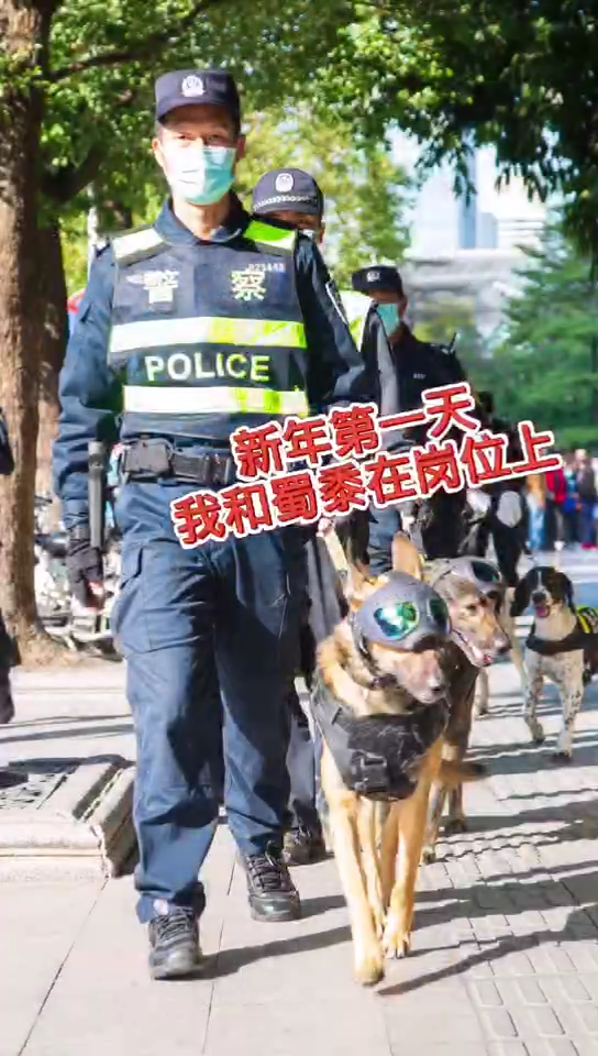 1月1日,广州海珠公安的警犬穿上了新制服跟随民警一起上岗巡逻。
