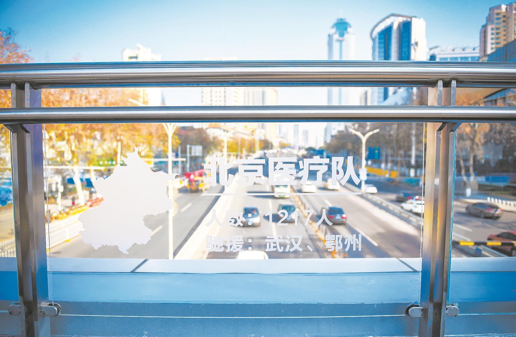 过街天桥的护栏玻璃上,印上了疫情期间全国援鄂医疗队的名字。这两天,武汉同济医院门口的抗疫主题天桥,走红网络感动全国网友。不少市民也慕名前来打卡,感谢全国人民对武汉对湖北的支援。