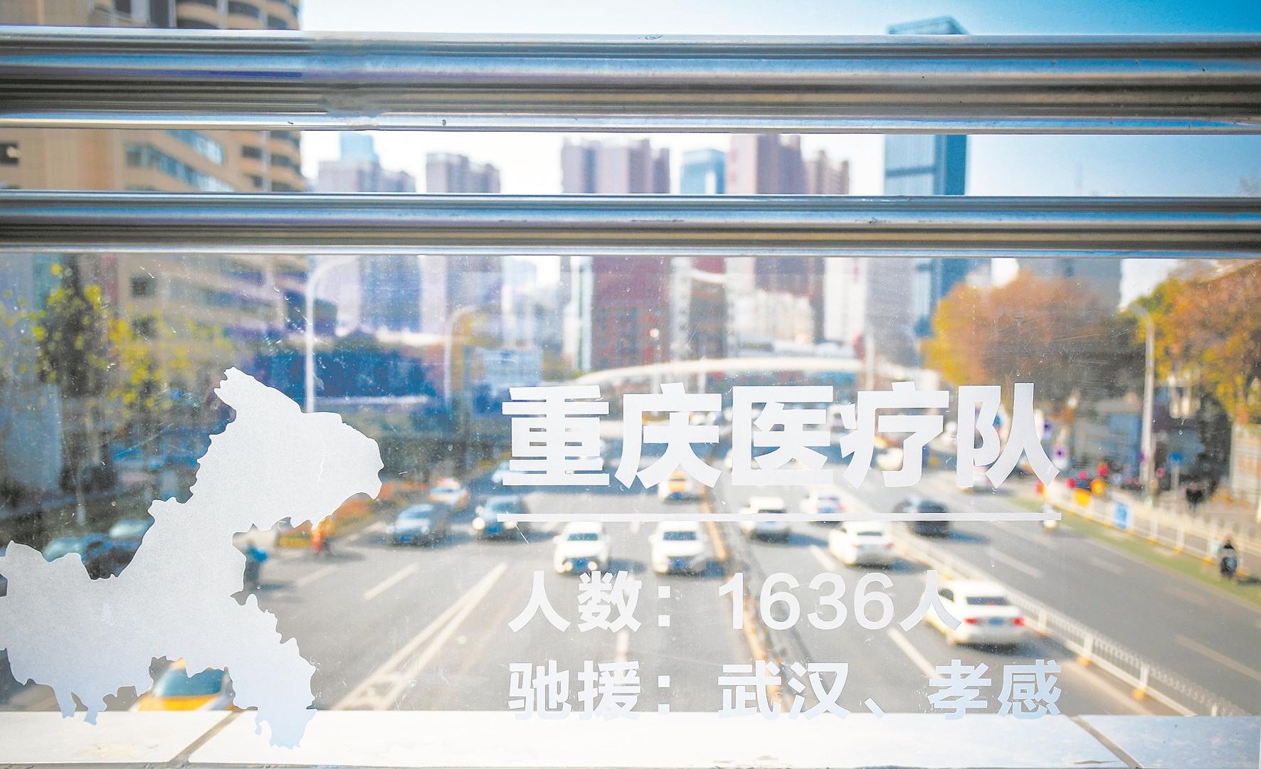 在现场记者看到,这座桥上修建有玻璃顶,桥两边的安全栏杆上安装有大量玻璃,每块玻璃现场测量高约79厘米,宽约140厘米。每相隔一块的玻璃上,写着各省、自治区、直辖市和解放军援助湖北医疗队名称、医疗队人数、支援过的城市,并配有一幅各省、自治区、直辖市的地图。