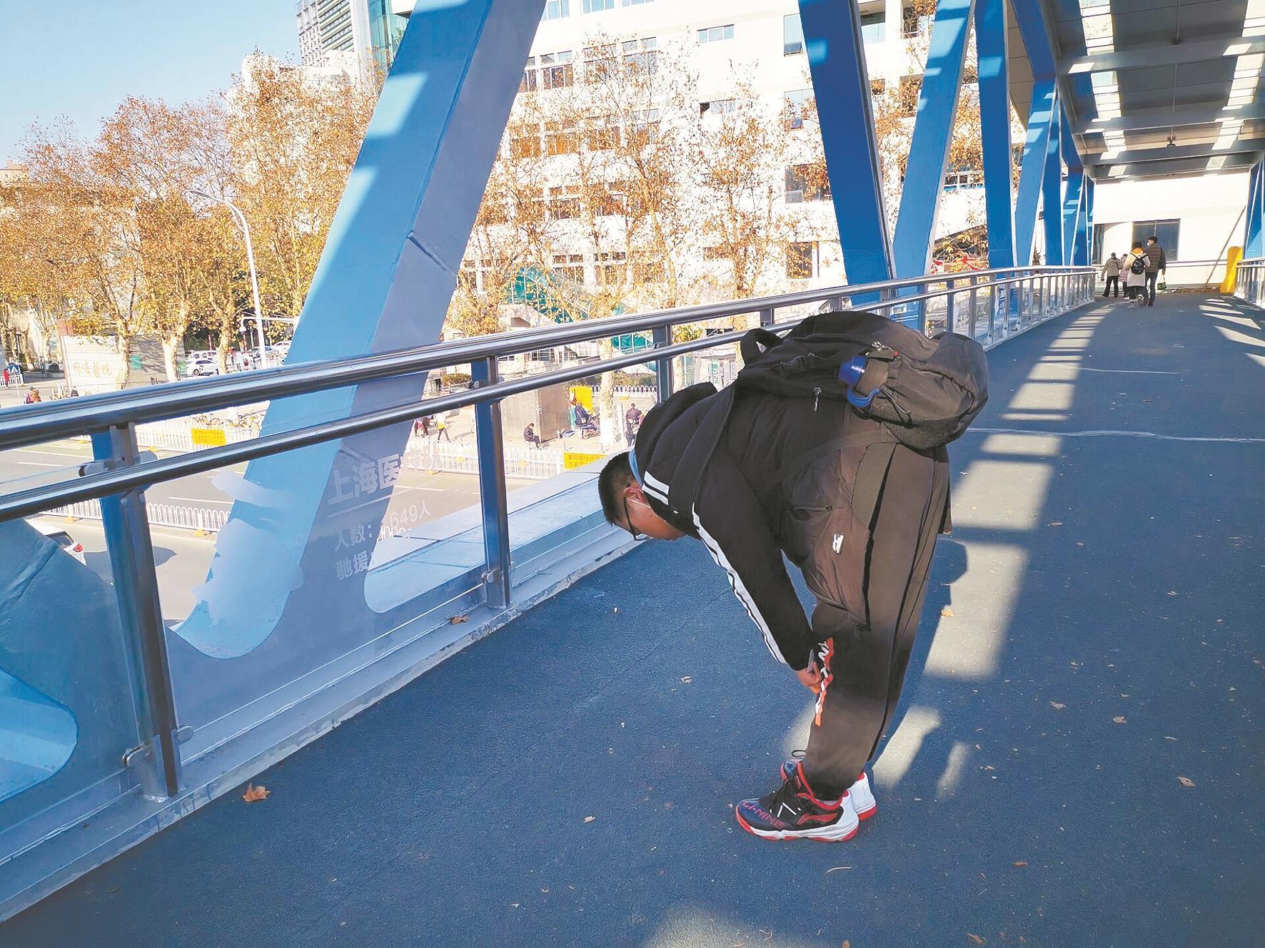 大学生张梦成在天桥上向每一个医疗队深深鞠躬