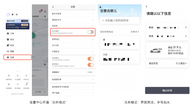 据悉,当前滴滴已成立老年人打车专项项目组,进行“一键叫车”相关功能的开发。老年用户可在滴滴出行APP设置中心打开“关怀模式”,该模式支持大号字体显示,简化了发单流程。亲友可替老人预先设置五个常用地址,此后,老人在叫车时直接点击目的地,就能一键叫车。