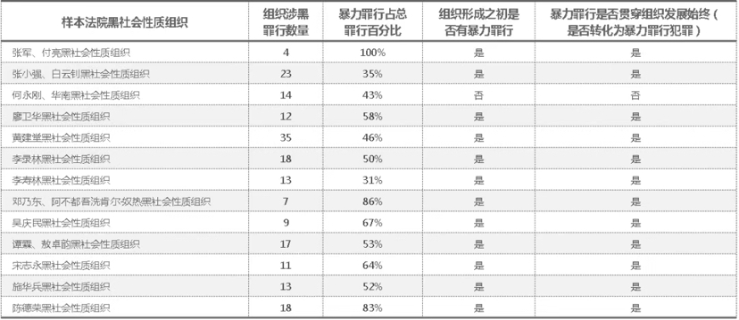 从行为方式来看,暴力特征明显,多直接妨害群众的人身安全和财产安全。海珠区法院十年来全部受理的36件13个涉黑社会性质组织案件来,均涉及故意伤害、寻衅滋事、非法拘禁、敲诈勒索、故意杀人、强迫交易等暴力性的刑罚罪名。暴力罪行广泛地存在于统计的13个涉黑组织中,而这往往直接影响社会的公共安全,严重伤及人民群众的生命健康,社会危害性极强。