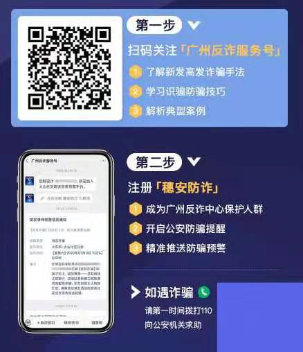 防范诈骗,你我同行!识别下方二维码关注广州反诈服务号,注册穗安防诈小程序!
