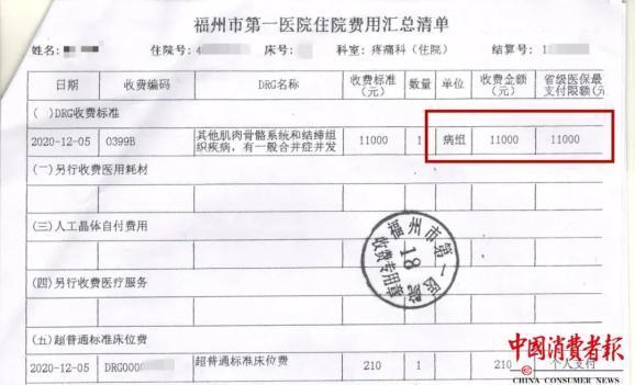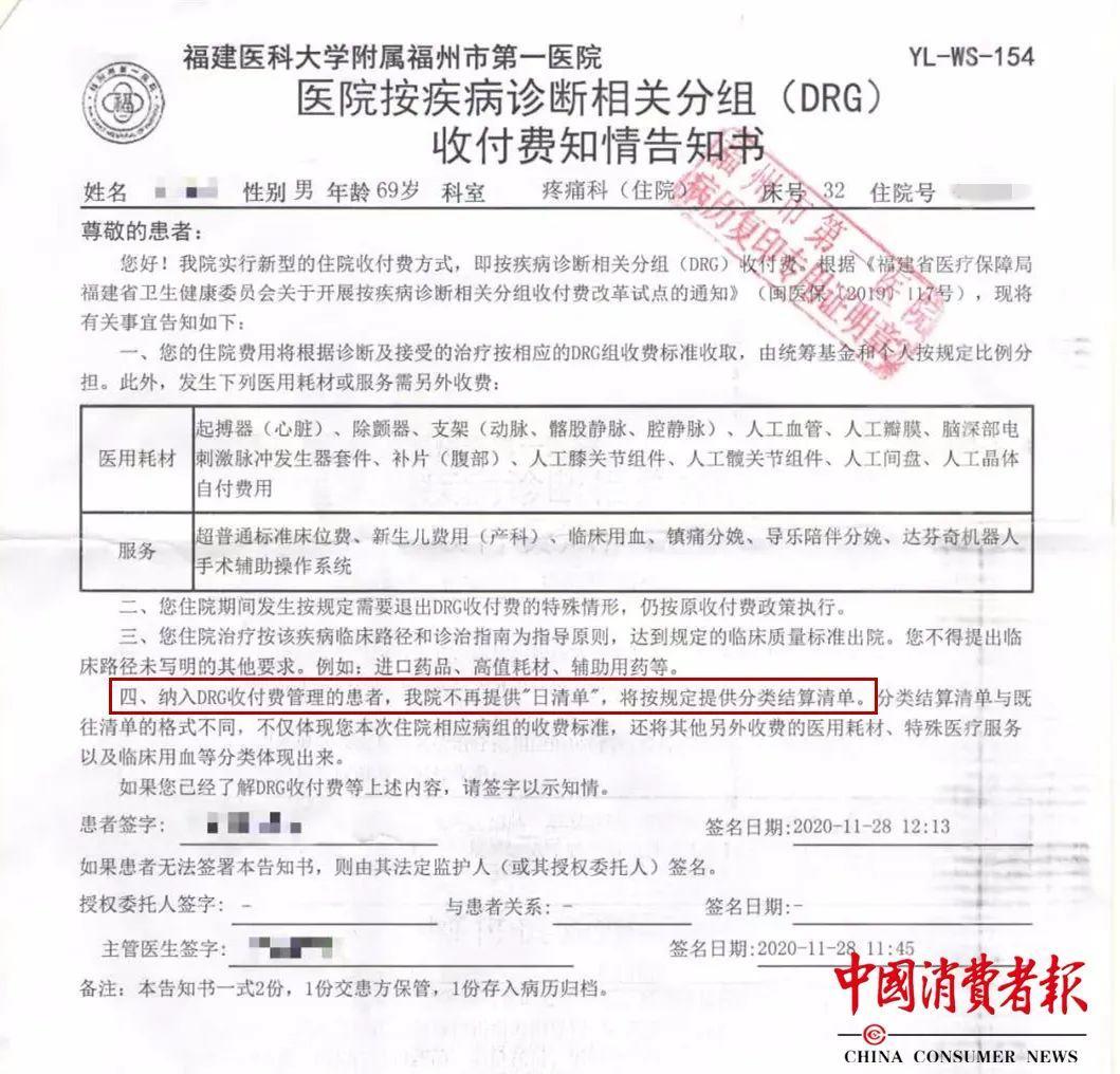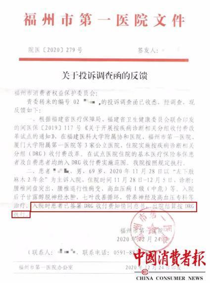 12月24日,福州市第一医院回复福州市消委会称,在试点医院住院的基本医疗保险参保患者及自费患者均纳入DRG收付费实施范围,该院按照规定执行。入院时该患者已签署知情同意书,出院结算按DRG执行。