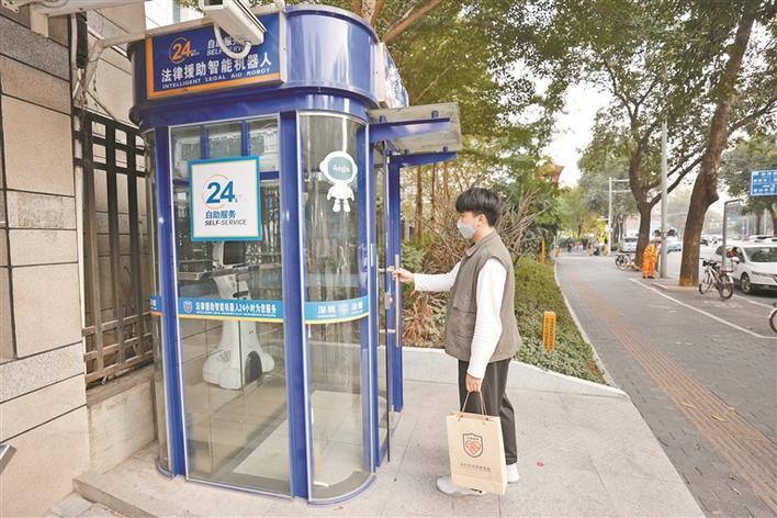 一位市民准备使用位于福田区天平大厦的法律援助智能机器人。