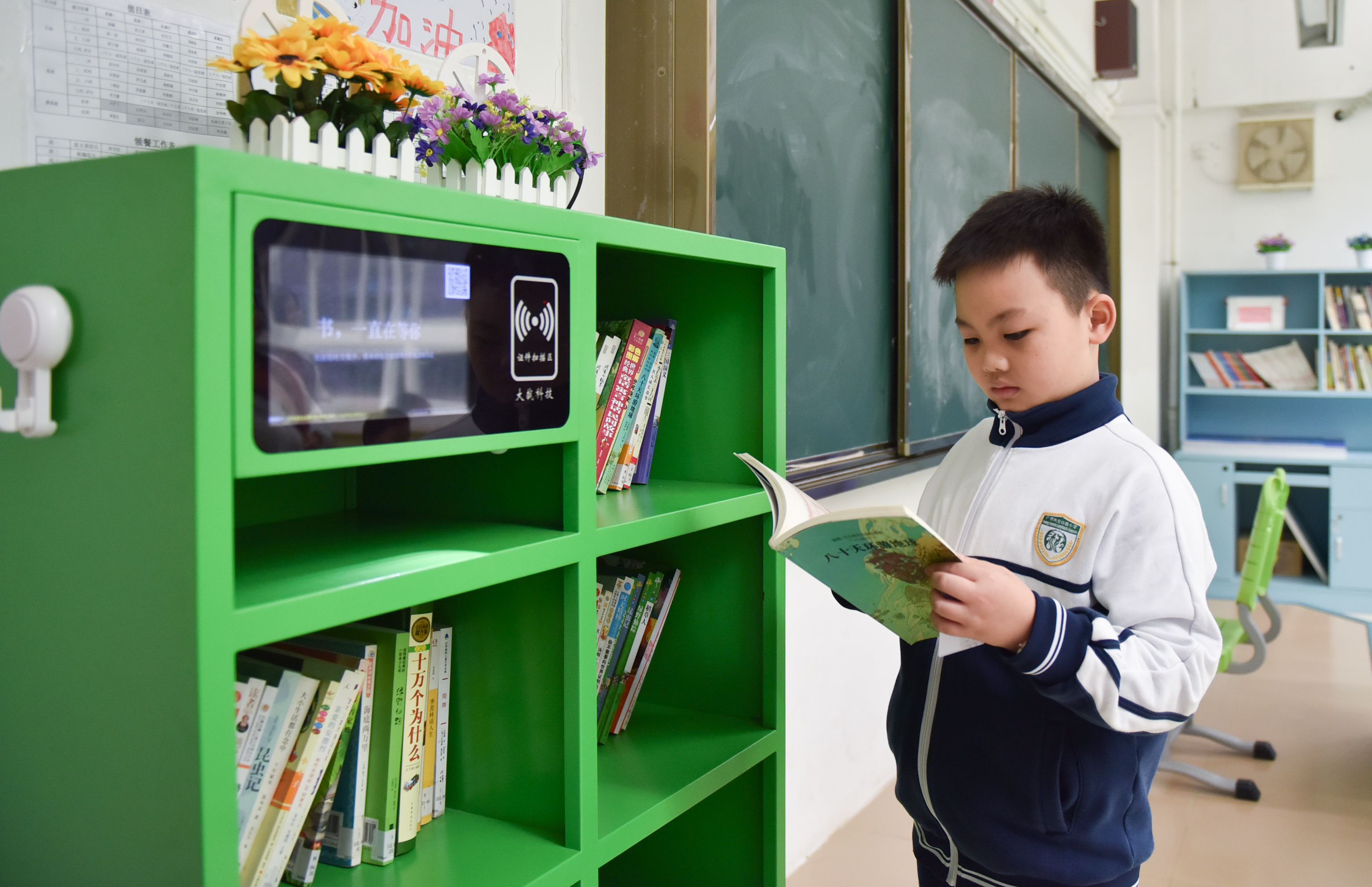学生在班级的智能图书柜借书