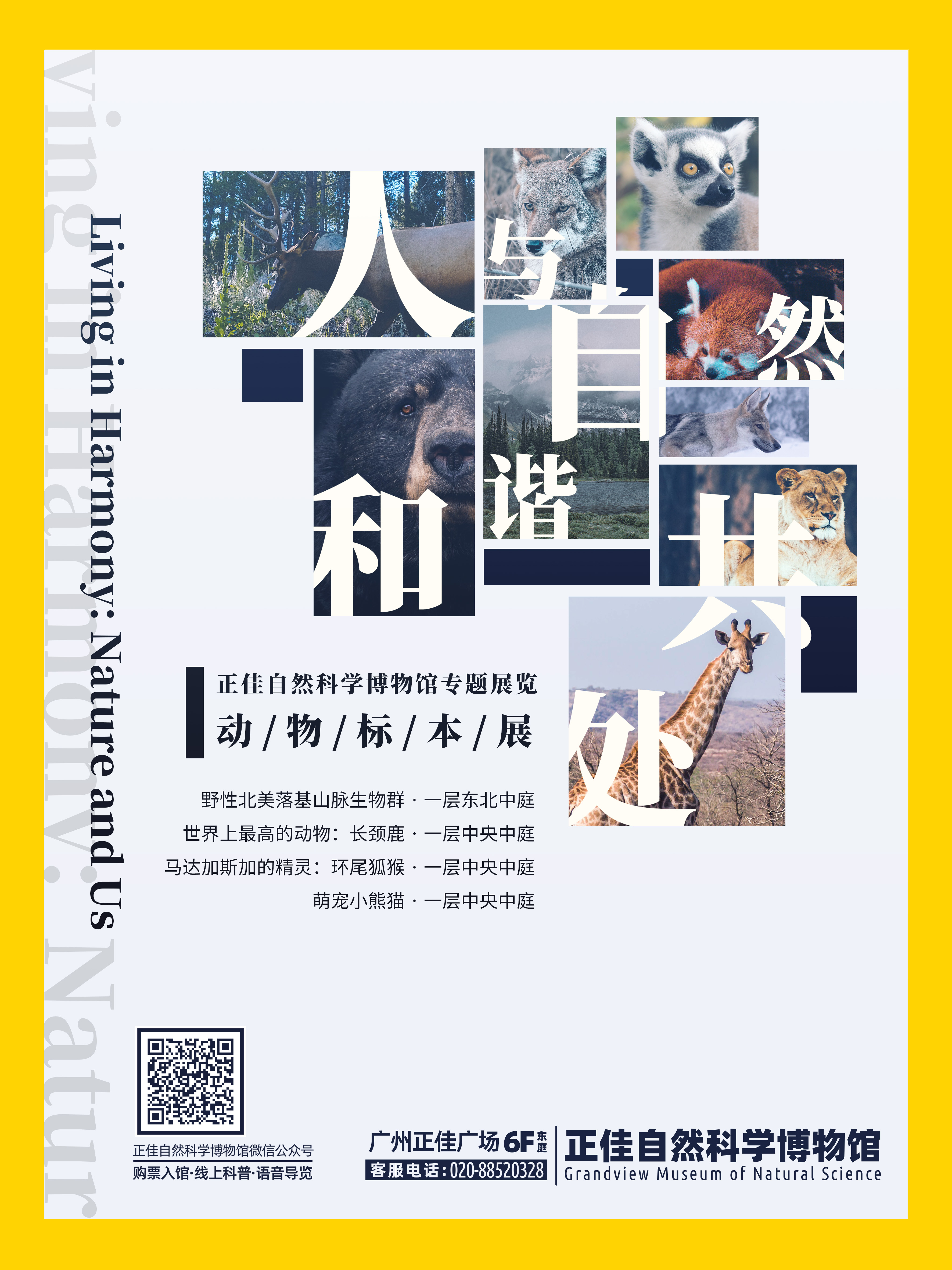 为普及野生动物保护知识,传递环境保护理念,正佳自然科学博物馆在广场1层中庭和东北庭特别推出专题展览——“人与自然和谐共处”动物标本展,通过系列动物标本、自然艺术景观、科普图文相结合,呈现了“野性北美落基山脉生物群”“世界上最高的动物:长颈鹿”“马达加斯加的精灵: 环尾狐猴”和“萌宠小熊猫”四大主题场景。