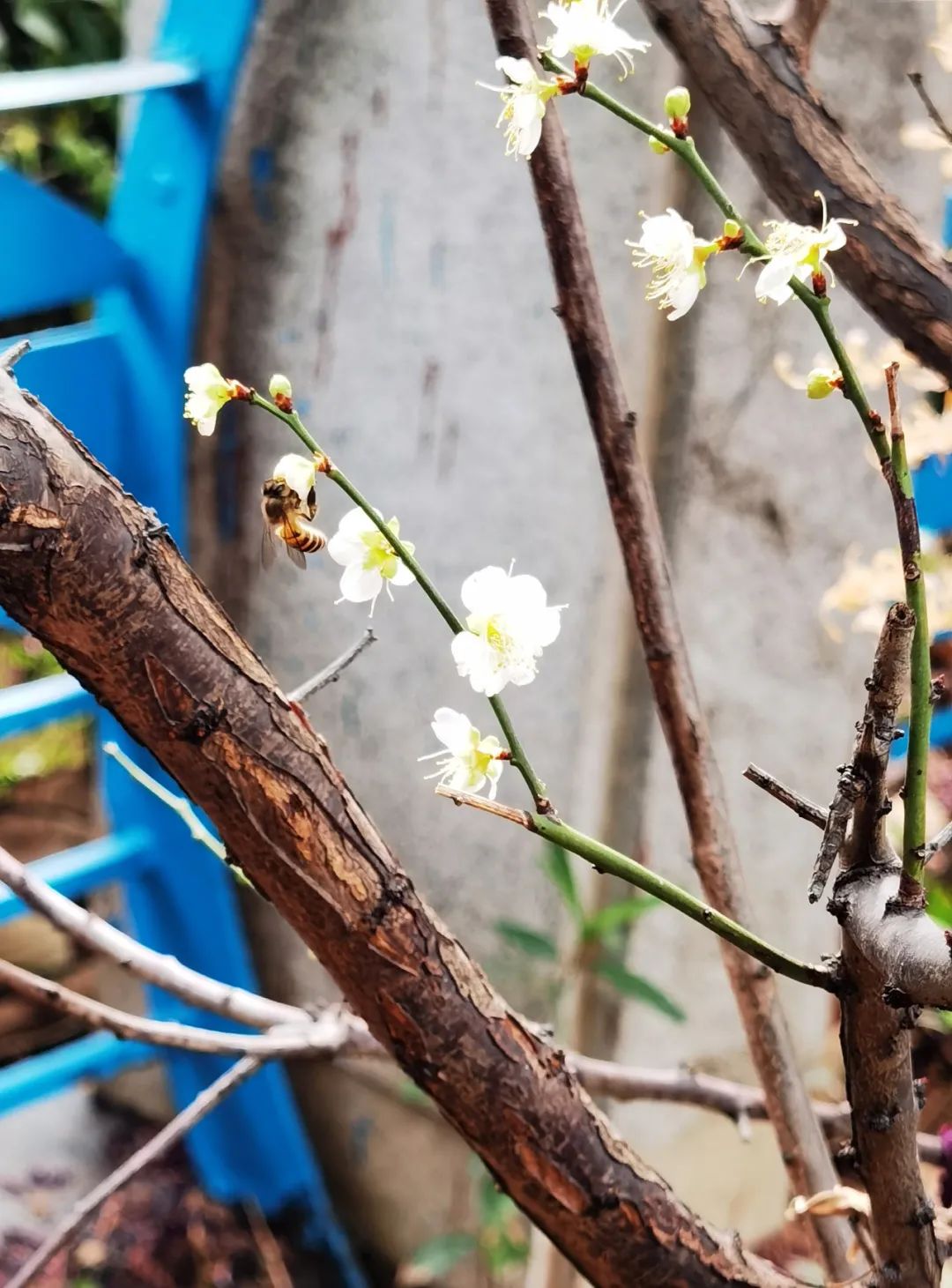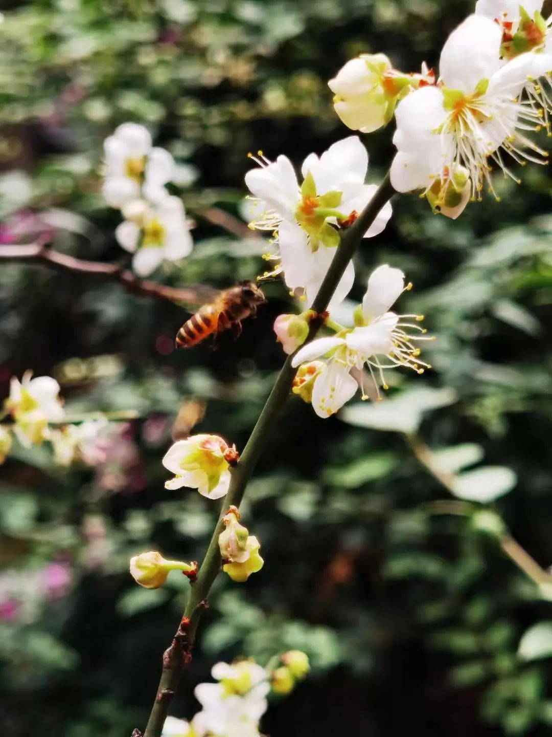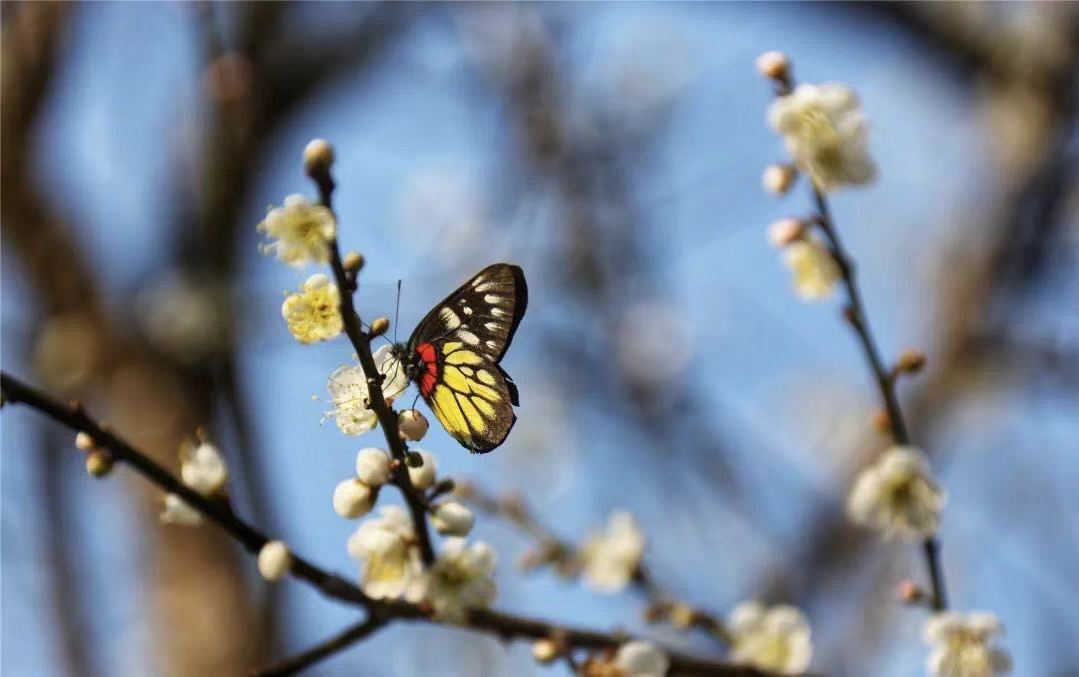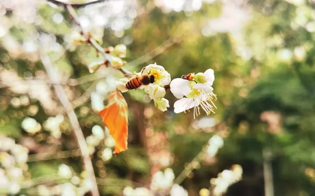 梅花枝头朵朵开,一团团一簇簇,缀满枝头,甚是可爱。远远地就能闻到梅花独有的淡淡的花香。辛勤的蜜蜂早就闻香而来。