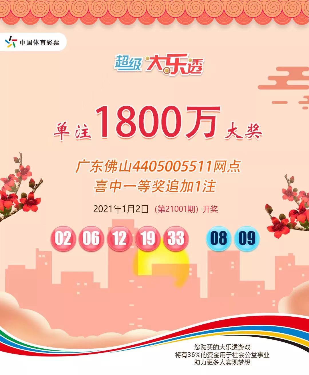 1月2日,2021年21001期,也就是首期体彩大乐透开奖,全国共中出2注一等奖,其中1注为1800万元追加投注一等奖,花落广东佛山。