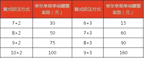 活动期间,购彩者采取7+2(前区选择7个号码,后区选择2个号码,下同)、8+2、9+2、10+2、6+3、7+3、8+3、9+3等8种复式投注方式(含追加投注)购买体彩大乐透且只中2+0即有赠票奖励,奖励标准如下: