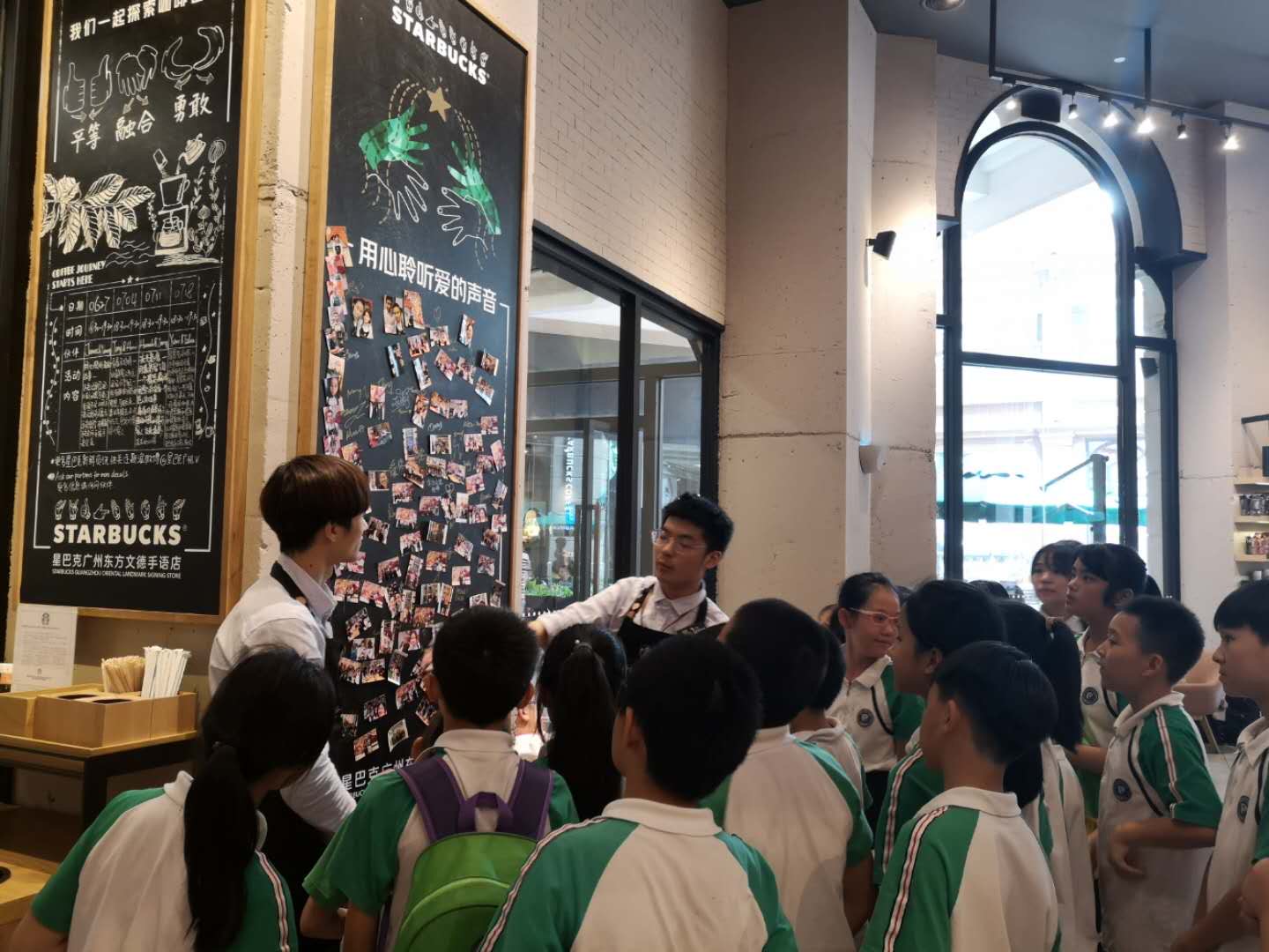 在广州东方文德广场的星巴克手语专题门店,有一半员工是听力障碍咖啡师,门店精心设置了每周手语课堂教学板,通过与广东省聋人协会合作定期组织并举办手语课堂和咖啡教室,以增进不同社群之间的理解和融合,每天吸引了大量的街坊光顾。