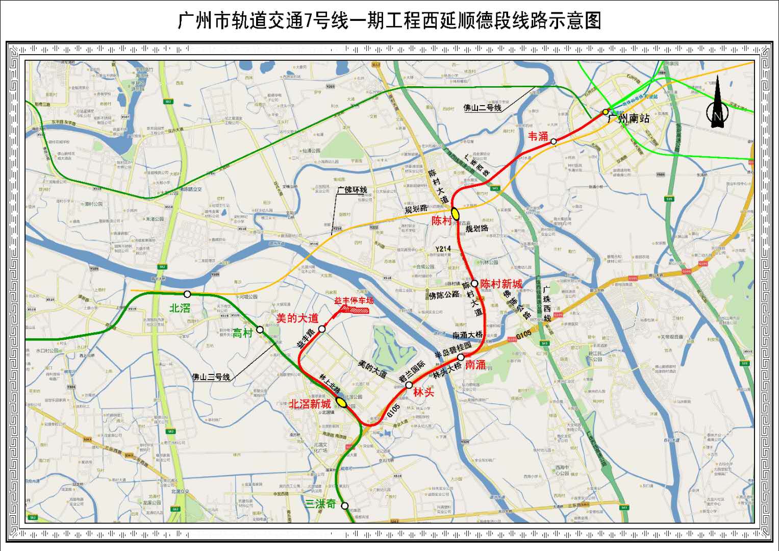7号线西延段全长13.45公里,从广州南站到美的大道,其中顺德区段长约11.8公里,广州段长约1.65公里。线路共设8座车站,其中北滘新城站与佛山3号线换乘、陈村站与广佛环线换乘、陈村北站与佛山11号线换乘,设益丰停车场1座。车辆采用6节编组B型车,最高运行速度80公里/小时。